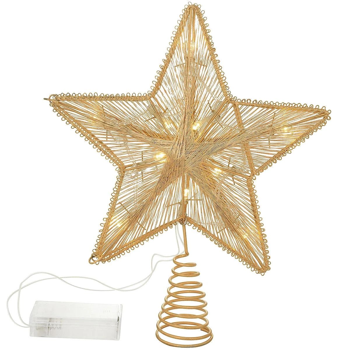 Shining brightly in a radiant hue of bronzed gold, this 3 dimensional star is stunning from every angle! Crafted of wire, our radiant 5 point star tree topper is artfully wrapped with rays of sparkling thread. Illuminated with 10 bright white LEDs, this battery operated topper features a traditional coil base and measures 11½” tall. Requires 2 AA batteries, not included.