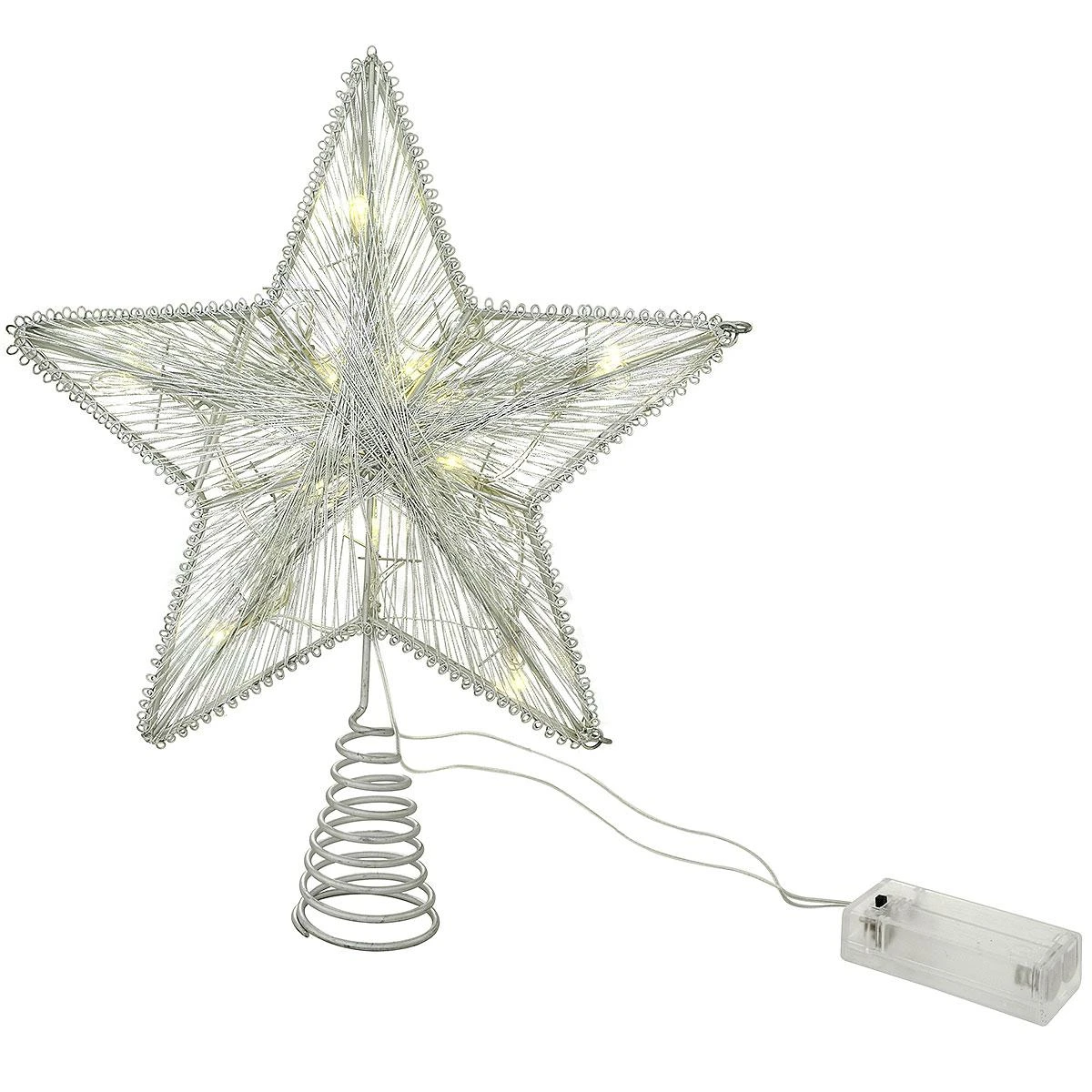 Shining brightly in a resplendent silver hue, this 3 dimensional star is stunning from every angle. Crafted of wire, our radiant 5 point star tree topper is artfully wrapped with rays of shimmering thread. Illuminated with 10 bright white LEDs, this battery operated topper features a traditional coil base and measures 11½” tall. Requires 2 AA batteries, not included.