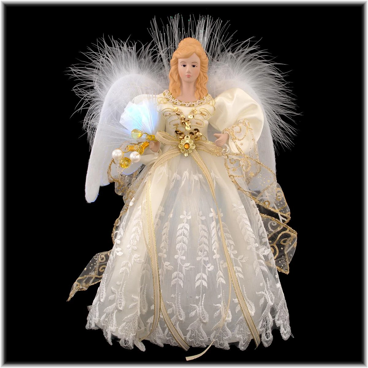 Add a heavenly glow to your Christmas tree with this gorgeous 12″ fiber optic angel. Dressed in a shimmering ivory gown delicately accented lace, sequins and cascading gold ribbons, our angel truly shines with color-changing lights that beautifully illuminate her magnificent feathered wings as well as her lovely bouquet and dress. This exquisite angel also makes a stunning centerpiece for your holiday table or mantle! Includes 120v AC Adapter. Indoor use only.