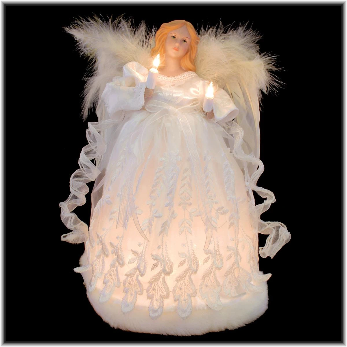 Add a heavenly glow to your Christmas décor with this beautiful angel tree topper! Featuring an exquisite hand-painted face and soft feathered wings, this gorgeous angelic figure is robed in a shimmering satin dress with a richly embroidered overlay trimmed with faux fur. Illuminated with 10 clear mini lights, our lovely 12″ ivory angel tree top is sure to illuminate your holidays for many years to come. Features include: