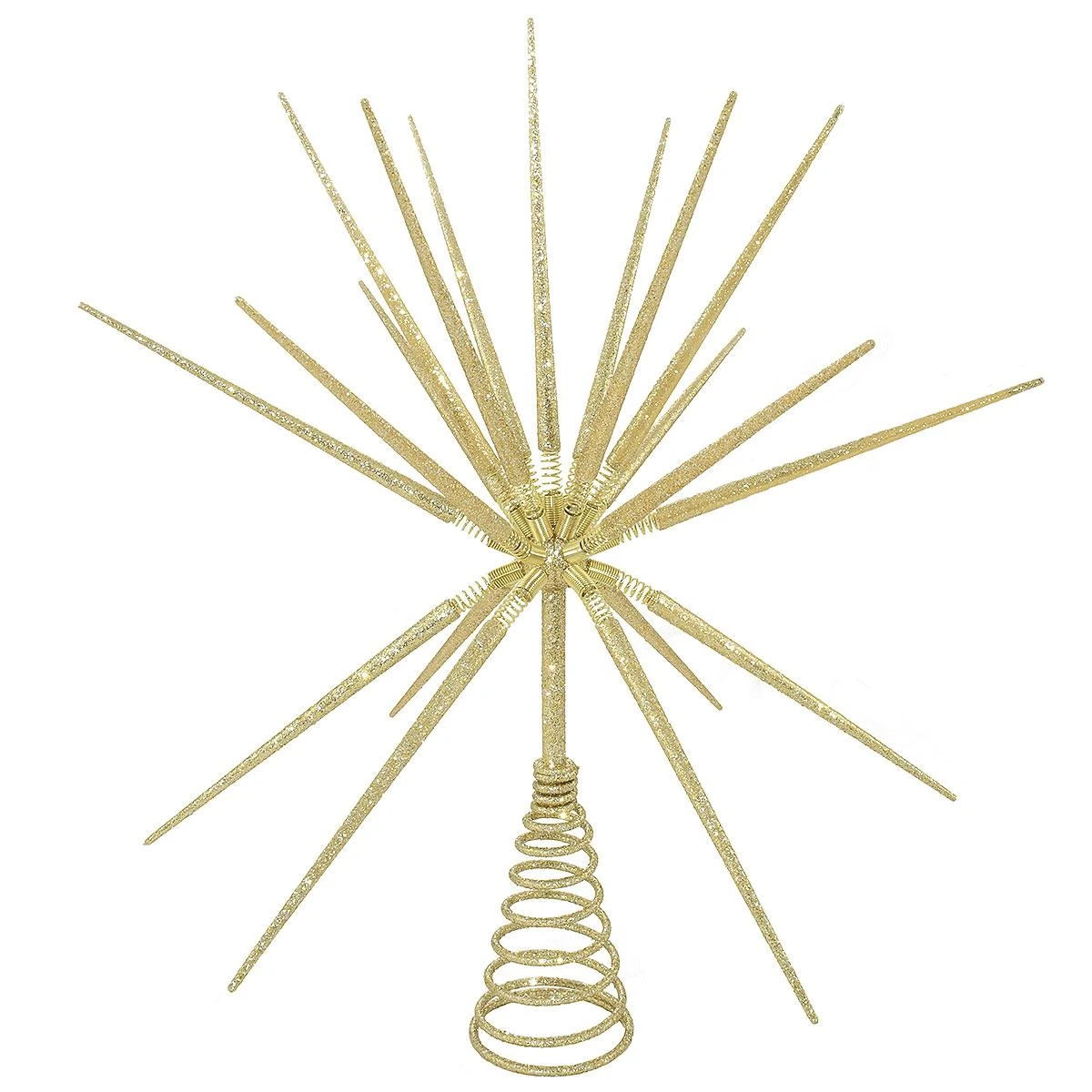 Add a spectacular glow to the tree with this enchanting 15″ gold star burst tree topper. Striking from every angle, our wire star bursts outward with a myriad of slender and glittering gold points. Topper features a coil base to accommodate the tip of your Christmas tree.Â