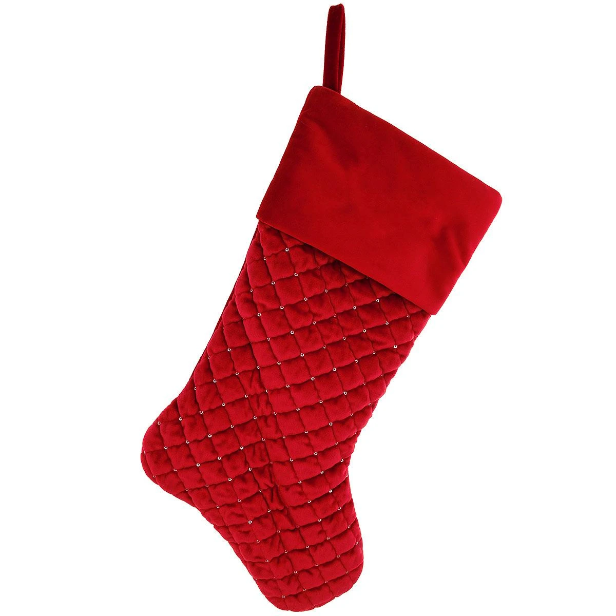 Twinkling with tiny silver sequins, this quilted red flannel stocking takes traditional to a stylish new level! Our 19″ stocking is completely lined in matching satin and features a wide red cuff.