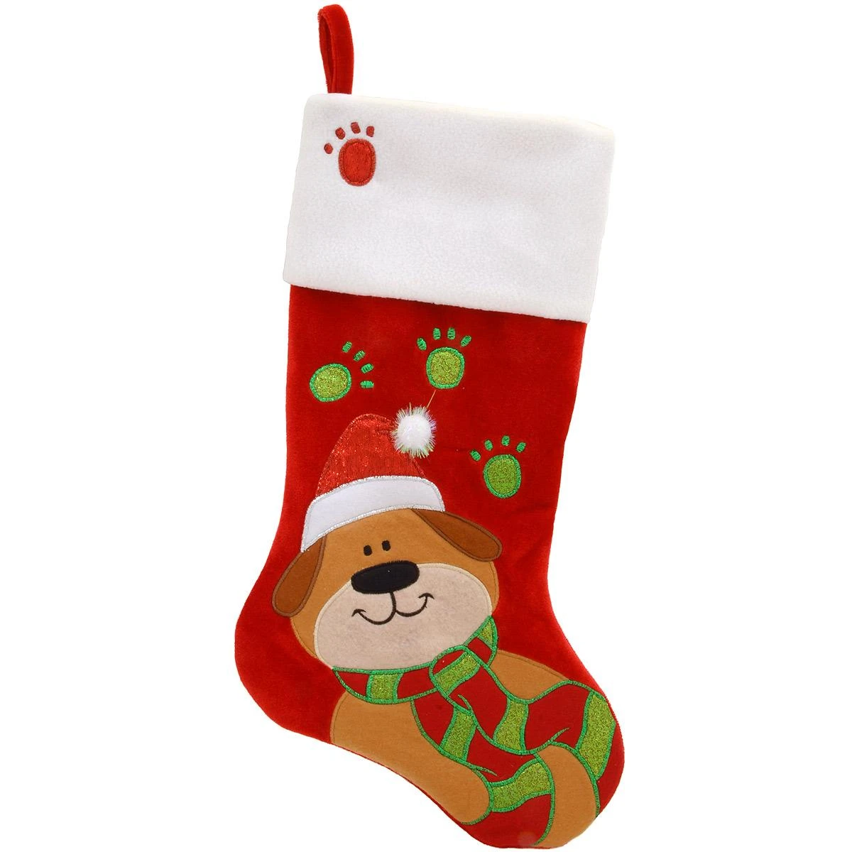 Your dog lover is sure to make tracks to the mantel when he or she sees this paws-atively adorable stocking! Our 20ยฝ” red velvet stocking with dog and paw prints is adorned with colorful appliques, shimmering stitching and a fluffy white pom-pom and depicts an adorable puppy festively dressed in a Santa hat and green & red striped scarf. Completely lined in satin, this fetching keepsake features a plush white cuff that’s ideal for adding a touch of personal-ityยฎ when you allow Bronner’s to embroider a name in red at no additional charge.