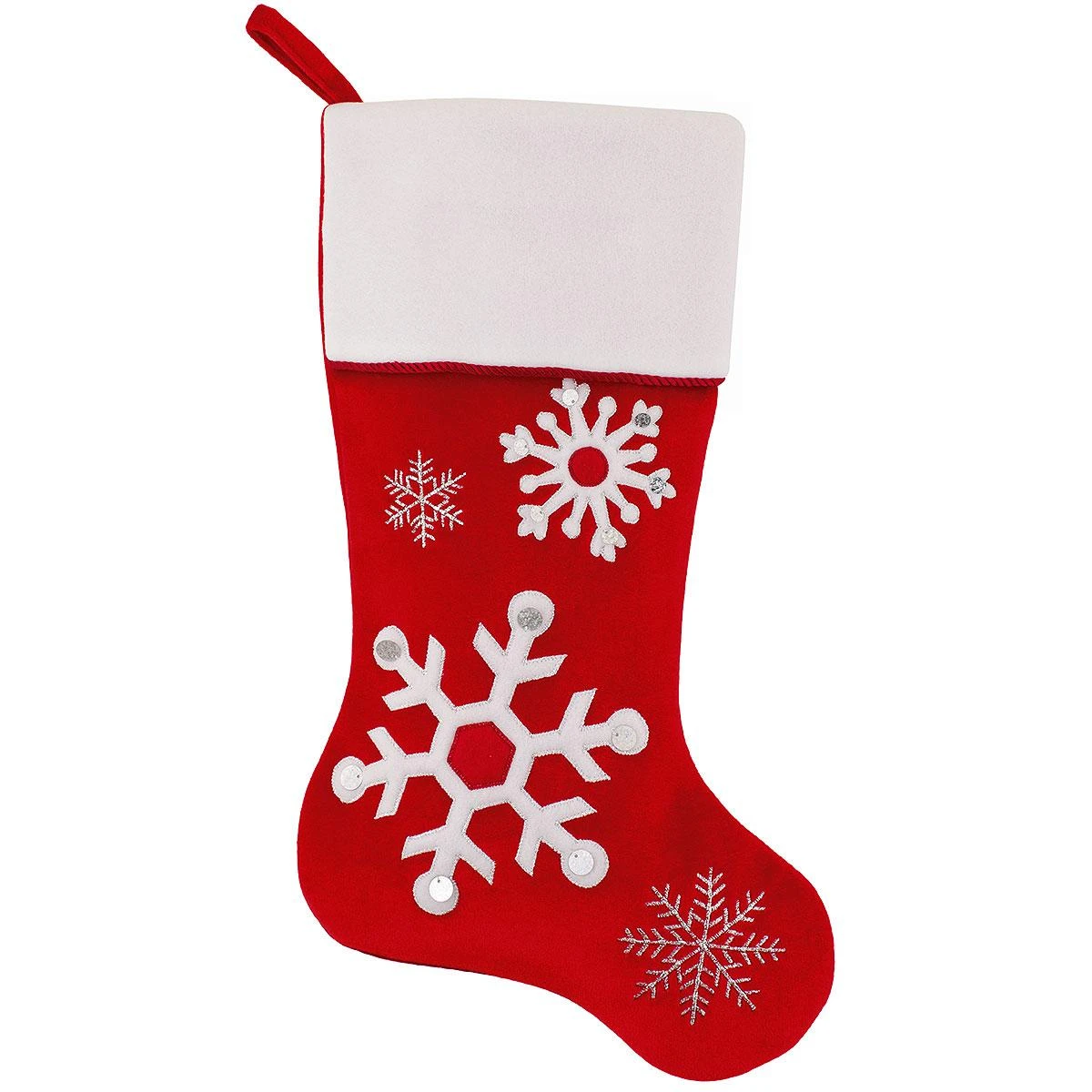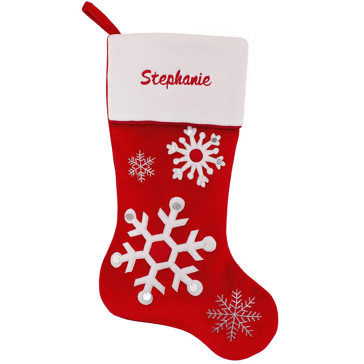 Enchanting snowflakes decorate this festive red stocking in flurries of white and silver. Accented with a variety of plush appliques, sparkling stitching, and prismatic silver sequins, our 20½” red velvet snowflake stocking is completely lined in red satin and features a white fleece cuff with a red braided trim. Allow Bronner’s to artfully embroider the name of your choice in red at no additional charge for a personalized gift he or she is sure to cherish!