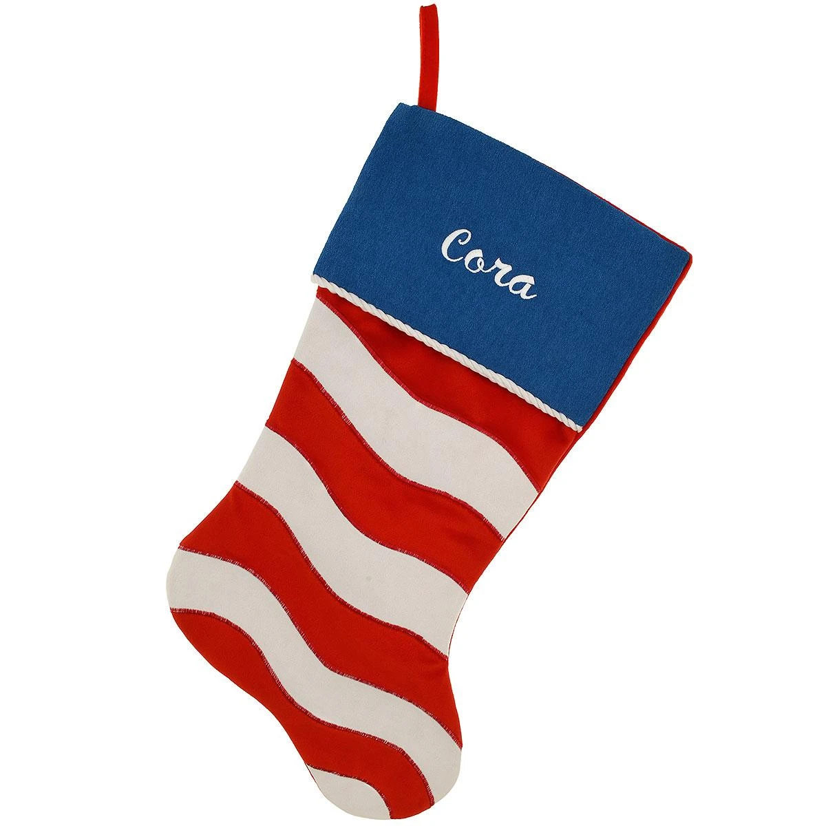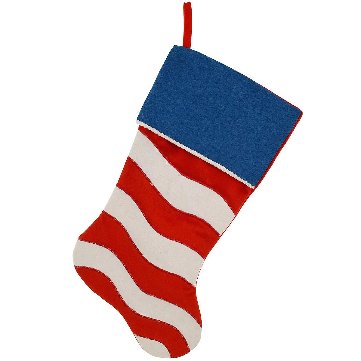 Every heart beats true for the red, white, and blue! With the look of soft suede, this patriotic stocking inspired by the American flag features wavy stripes of red and white, its wide blue cuff is edged with white rope trim. Completely lined in red sateen. Makes a great gift for military families and patriots alike!