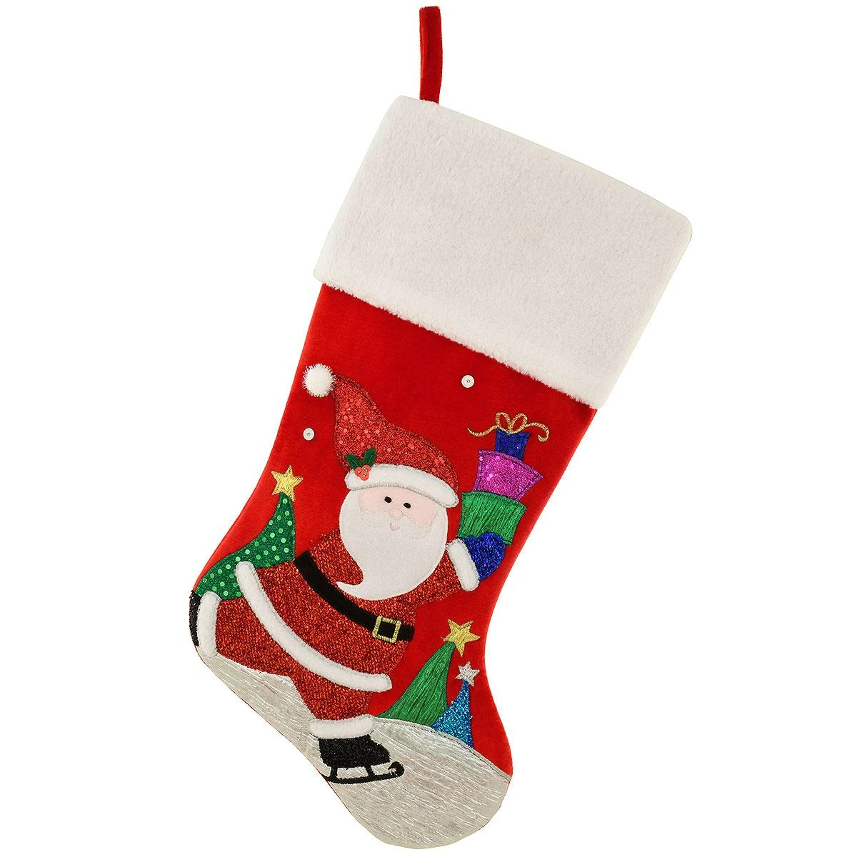 Santa glides through the season on a pair of magical skates to deliver some extra special Christmas gifts! Crafted of red velvet, our whimsical 20.5″ stocking features colorful appliques in shimmering lame and eye-catching sequins. Sock is topped with a plush white cuff and is completely lined in polyester.Â
