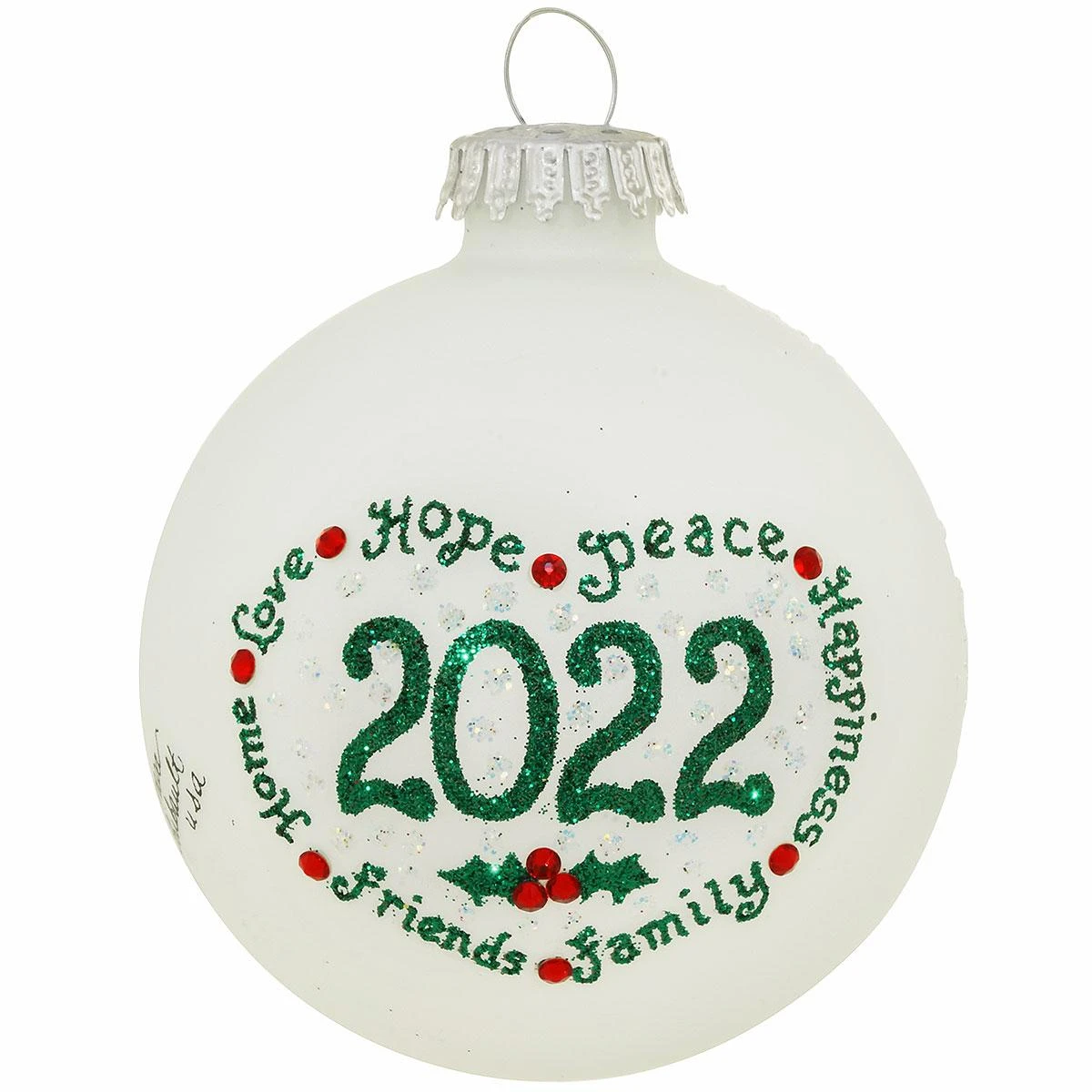 Crafted of glass, this limited edition design by Teresa Thibault makes a wonderful gift for family and friends. Accented with shimmering green glitter and dazzling red Swarovski crystals, ornament celebrates the year 2022 with a heart-shaped message and sentiments: Home, Love, Hope, Peace, Happiness, Friends and Family. Made in the USA, 3ΒΌ” ornament comes attractively packaged for safe storage and easy gift giving.Β