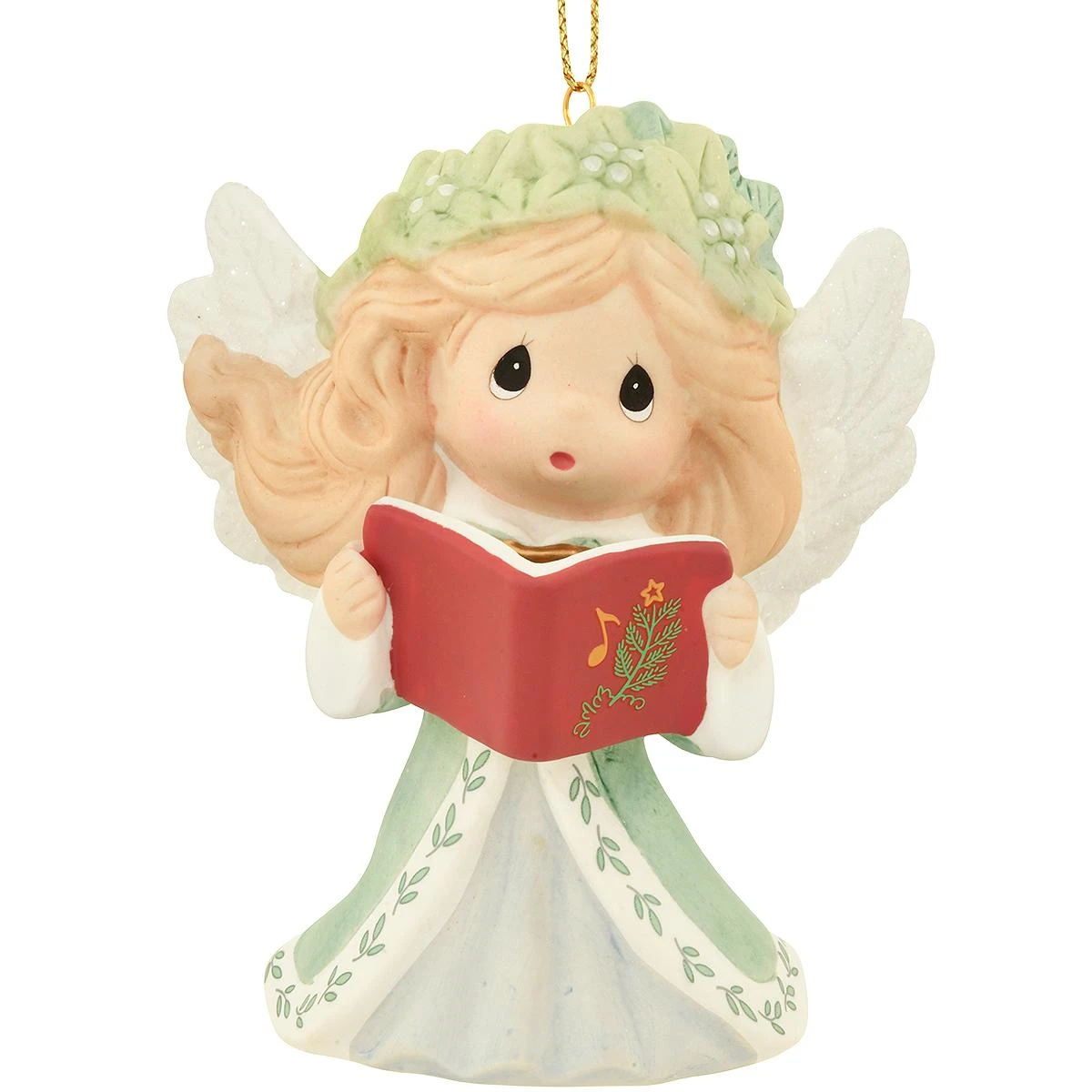 “Wishing You Joyful Sounds of the Season” features a cute little angel in an elegant green gown singing Christmas carols while holding a songbook. This adorable Precious Moments® 13th annual angel ornament is expertly crafted from smooth ivory bisque porcelain with vivid hand-painted and glitter accents. 3½” collectible comes ready to hang on a gold cord. Precious Moments© #231018