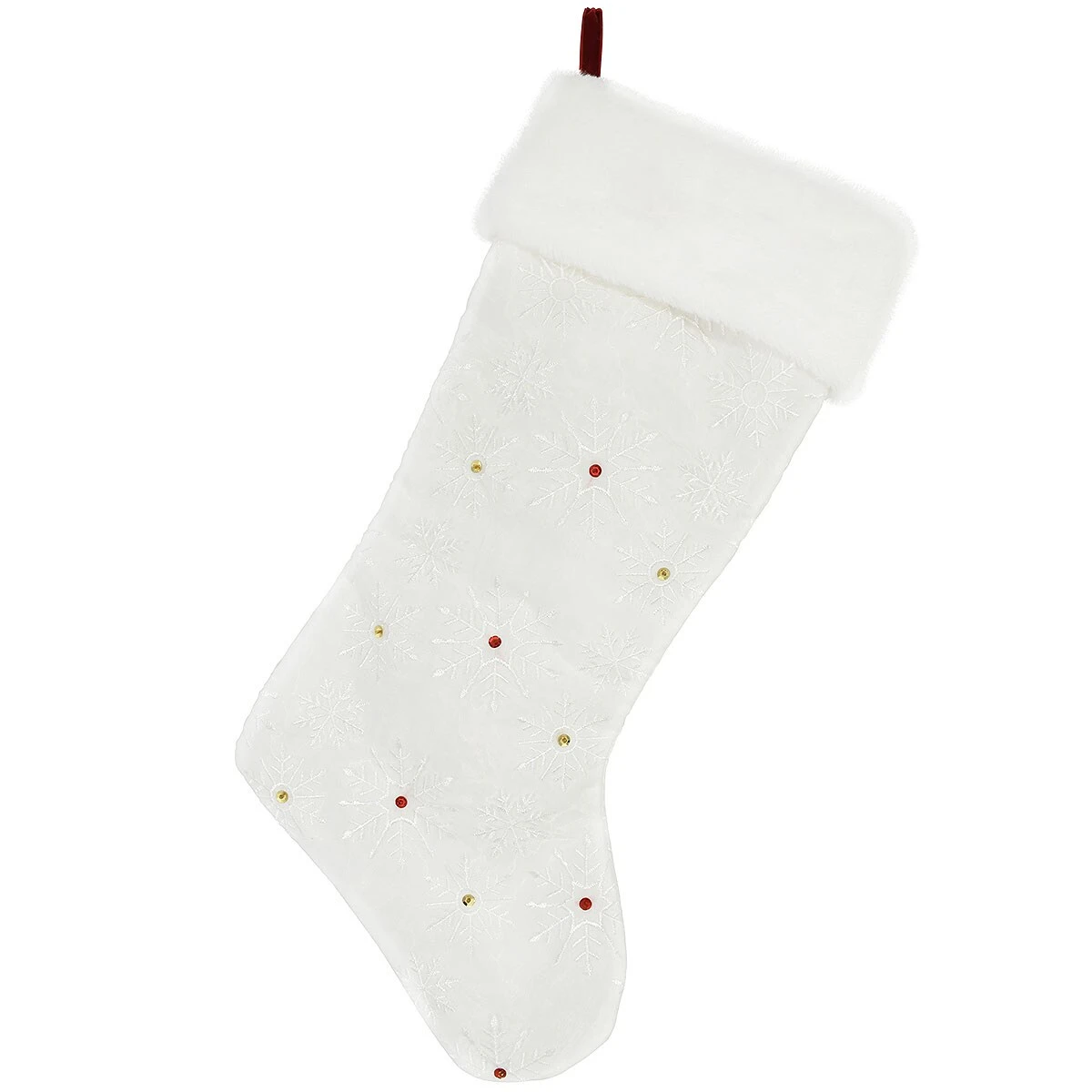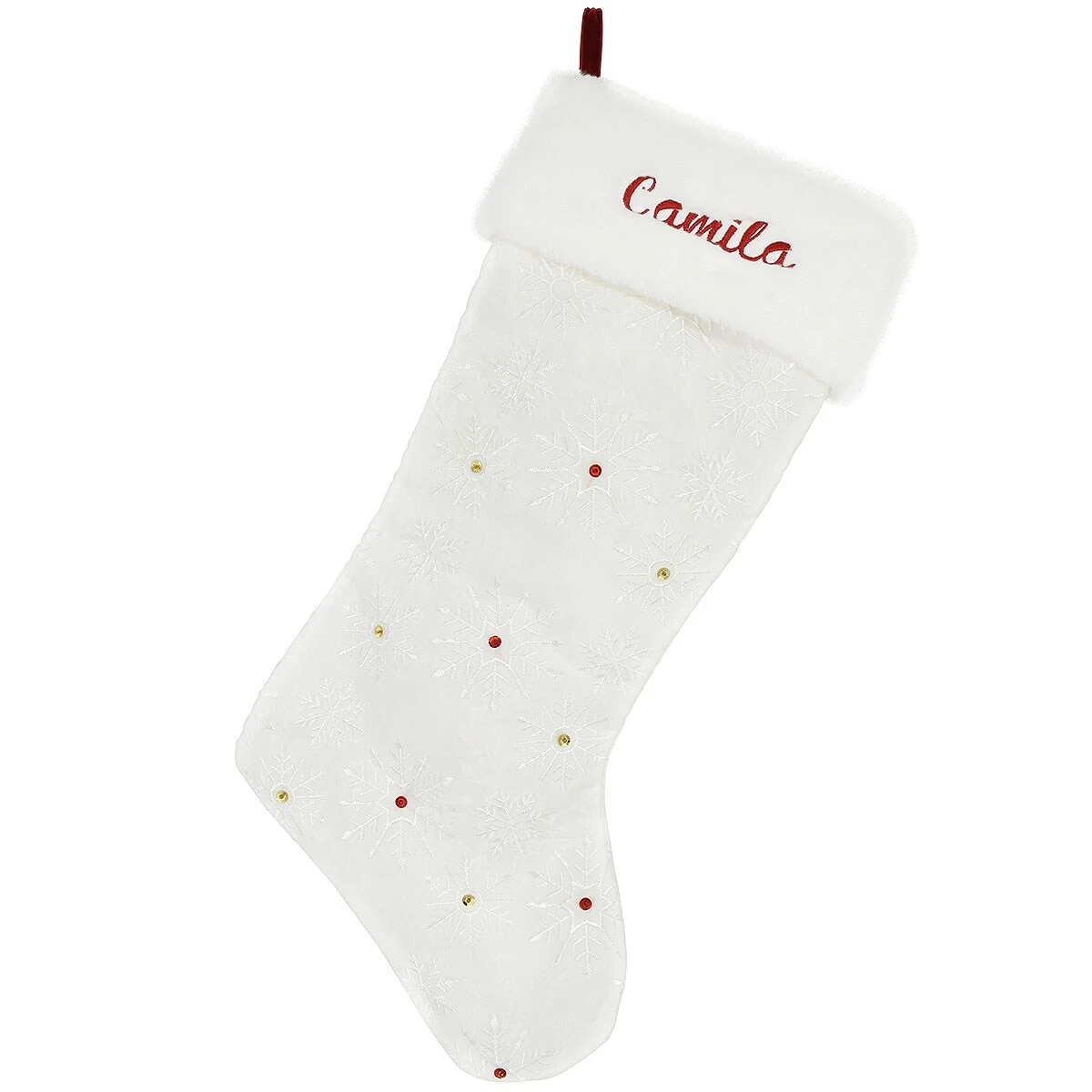 Let it snow, let it snow, let it snow! Celebrate the season with this elegant stocking hanging above the mantel or stairway. Stunning in white sateen, our 20½” stocking features a sheer organza overlay patterned on both sides with a flurry of white embroidered snowflakes. Accented with sparkling gold and burgundy sequins, this captivating stocking has a soft, white “fur” cuff that’s perfect for holding the name of your choice when you allow Bronner’s to add personalization in vivid burgundy embroidery at no additional charge.