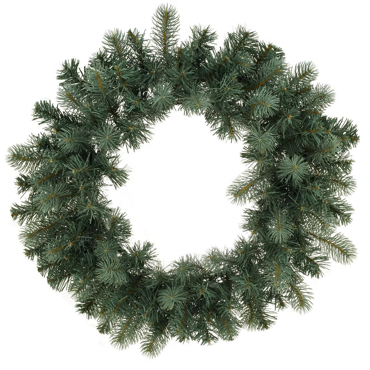 A festive wreath adds a welcoming touch to spruce up your home or office during the holiday season. Our beautiful 24″ blue Douglas fir wreath features a mix of PE and PVC branches artfully arranged on a sturdy wire frame for life-like appeal. A convenient and long-lasting alternative to fresh cut greens, this artificial wreath looks great unadorned or spruced up with your favorite ribbons, picks, lights or decorations!