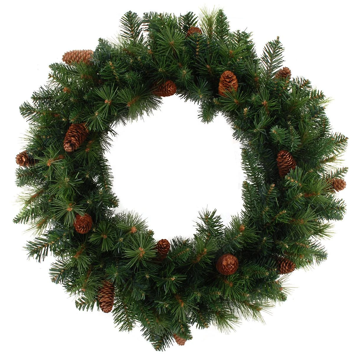 A practical and convenient alternative to fresh-cut evergreens, this lovely faux-fir wreath will add long-lasting beauty to your holiday dΓ©cor! Crafted on a sturdy metal frame, this gorgeous 24″ woodland wreath is designed with 145 lush, life-like branches and real pinecones and looks great unadorned or spruced up with your favorite ribbons, picks, or decorations!