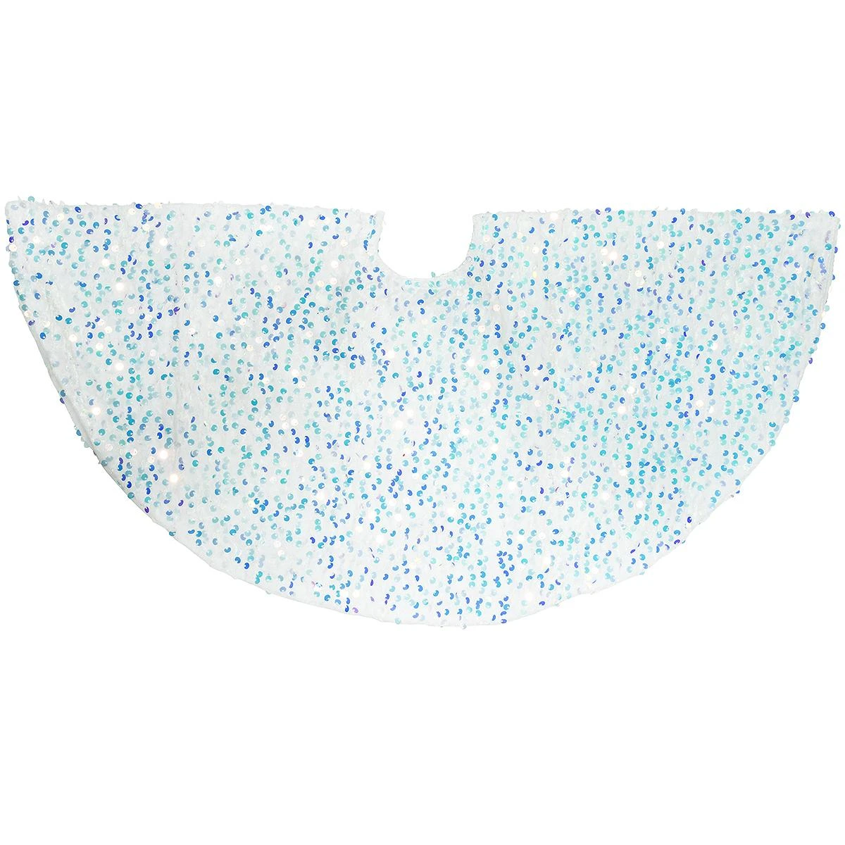 The season will be extra MERRY and BRIGHT when you wrap this dazzling skirt around your miniature tree! Our 24″ white velvet tree skirt is completely covered in iridescent sequins that shimmer in eye-catching hues of turquoise, purple, silver, and pink. Skirt is fully lined in white polyester and features hidden Velcro strips to keep it neatly in place.