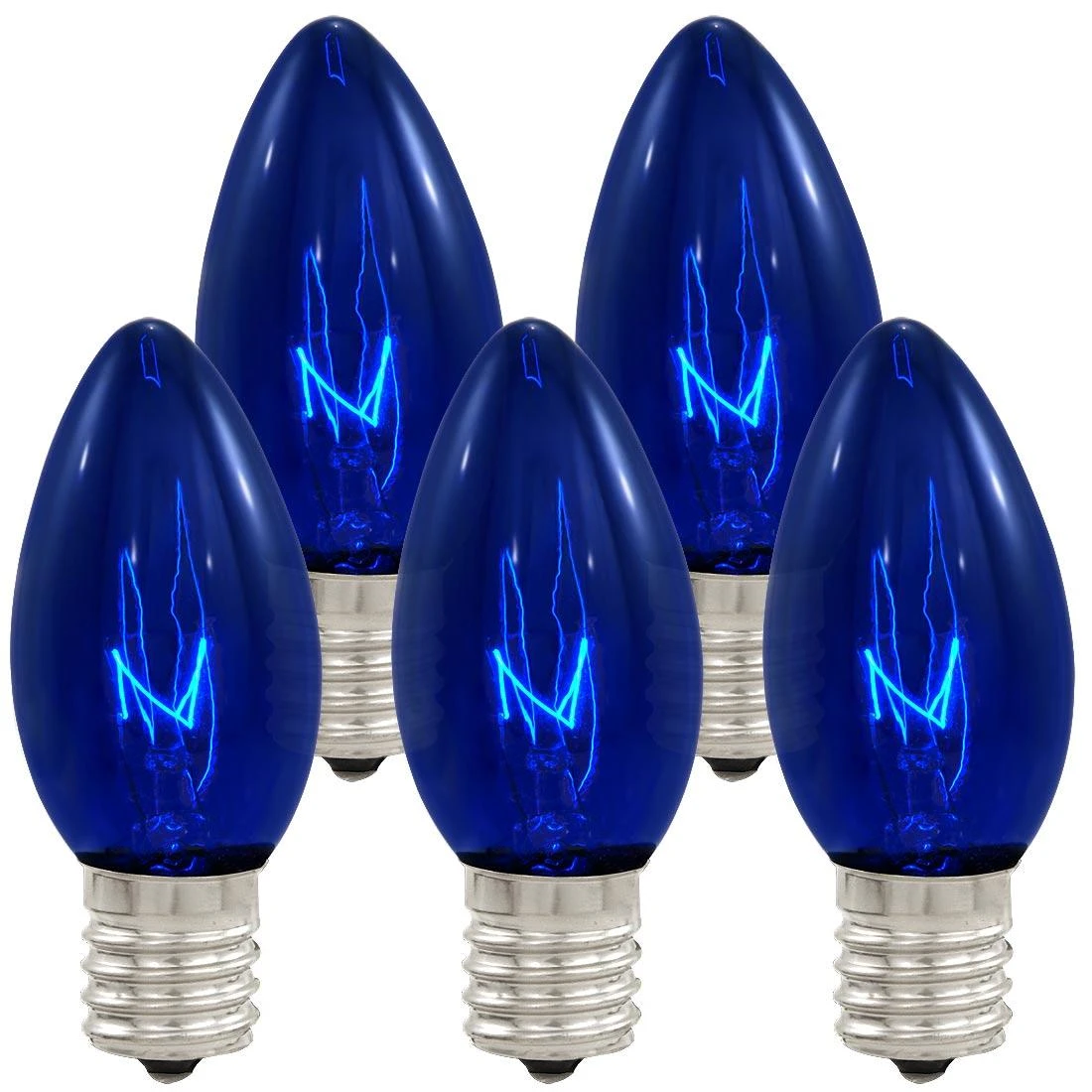 Restore a sapphire flair to that old light strand with this deLIGHTful pack of transparent C9 replacement lamps! 25 blue-colored C9 replacement lamps are double-coated with pigment to shine brightly with rich color. Commercial grade, these replacement bulbs feature weatherproof bases and fade-and peel-resistant coatings to withstand winter weather and corrosive ocean air.