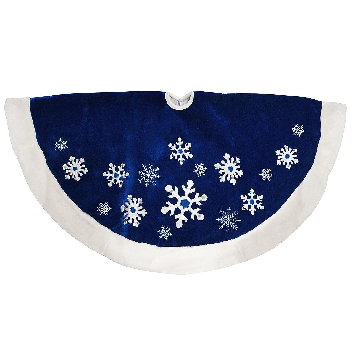 Let it snow all around your tree with this enchanting tree skirt! Our 48″ blue velvet tree skirt with snowflakes is decorated with vivid white velvet appliques, shimmering silver stitching, and sparkling sequin accents. Edged with a soft, white fur border, this elegant tree skirt is completely line in white sateen and features hidden Velcro strips to keep it neatly in place.