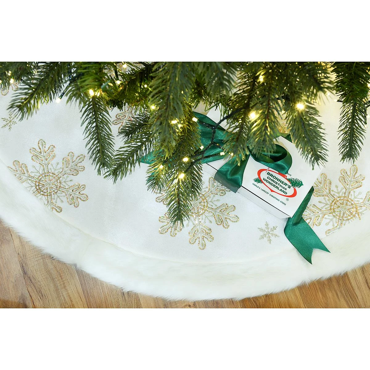 After the lights and ornaments are up, why not dress the tree in a festive skirt? Our 48″ ivory micro velvet tree skirt is richly patterned with a flurry of gold sequined snowflakes. Complete with a plush white fur border, skirt is fully lined in white sateen and features hidden Velcro strips to hold it securely in place.