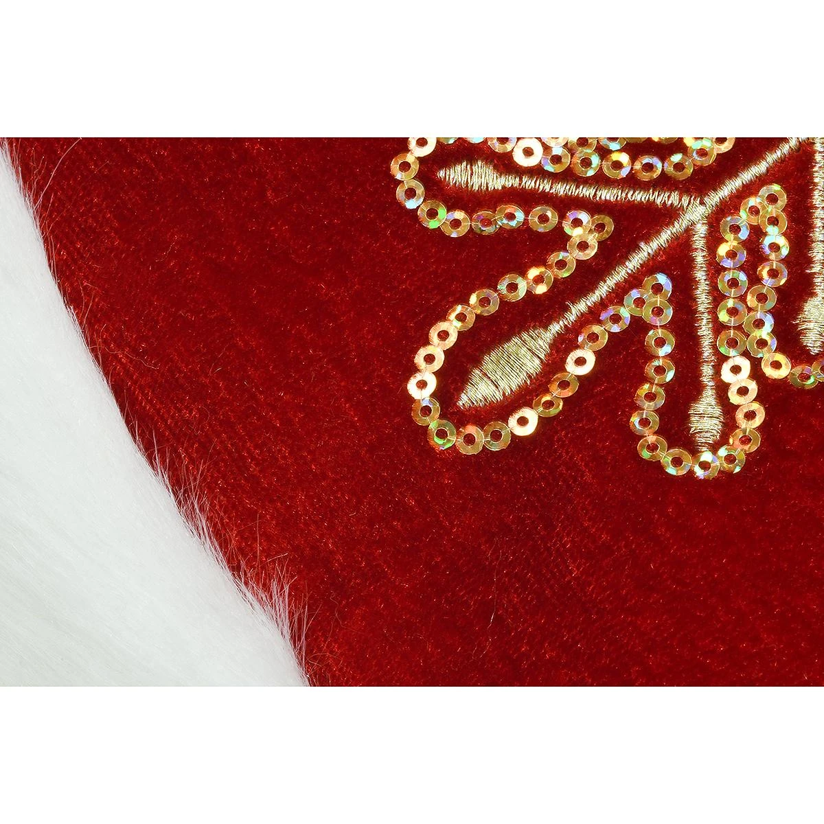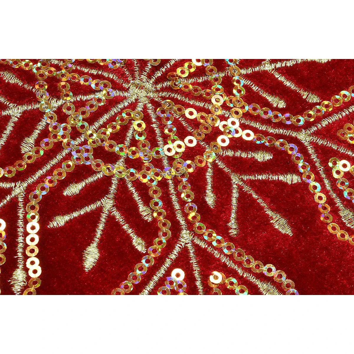 Add a cool vibe to your holiday decor with this stunning 48″ red velvet tree skirt with gold snowflakes! Shimmering with skillful stitching and eye-catching sequins, tree skirt features a border of plush white fur. Skirt is fully lined in white sateen and features hidden Velcro strips to hold it securely in place.