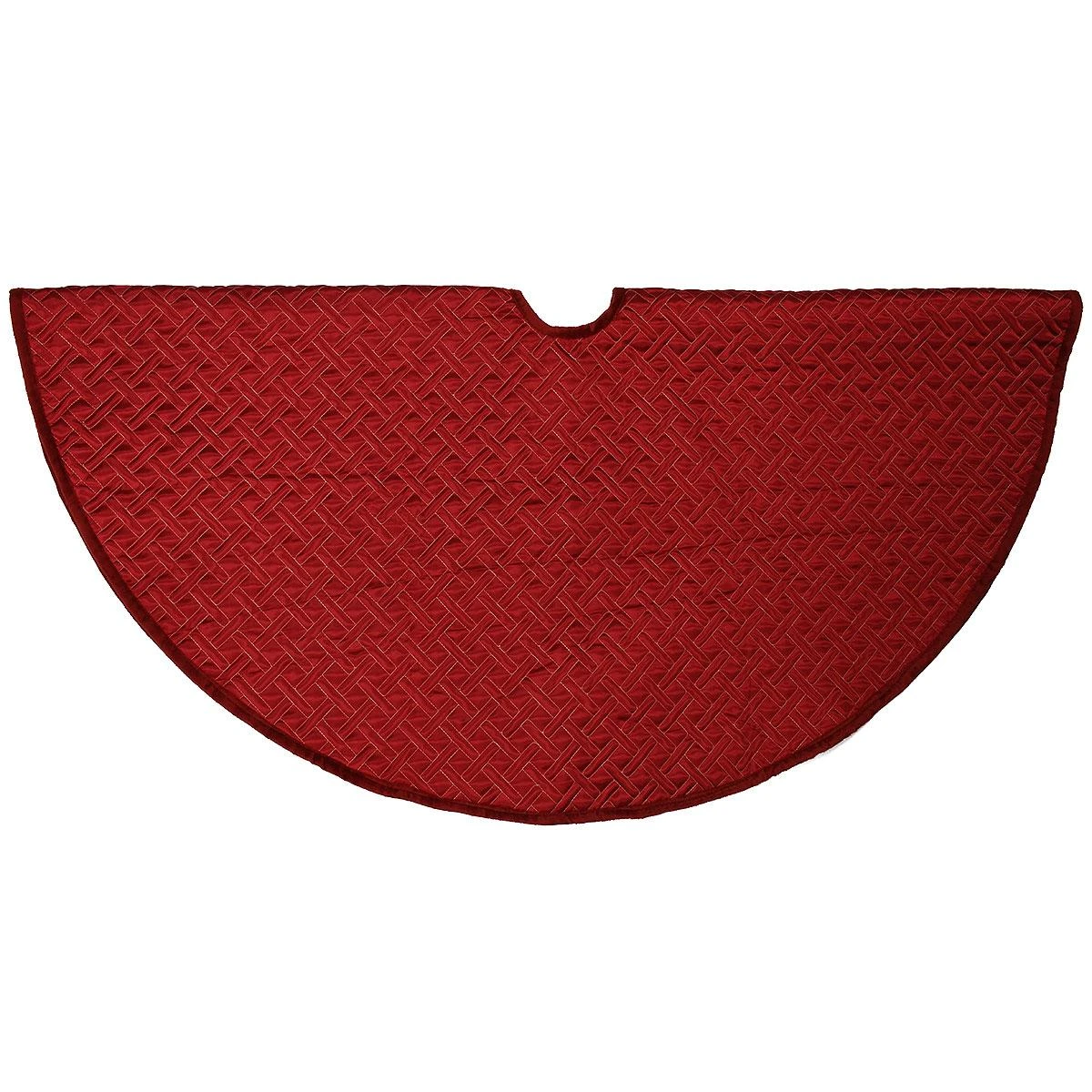 This festive tree skirt will add a cozy charm to your holiday dรฉcor! Gold stitching in a basket weave pattern adorns this beautiful 48 inch reversible burgundy quilted tree skirt. Velvet on one side, and sateen on the other, skirt ties with bows to hold it neatly in place. ย