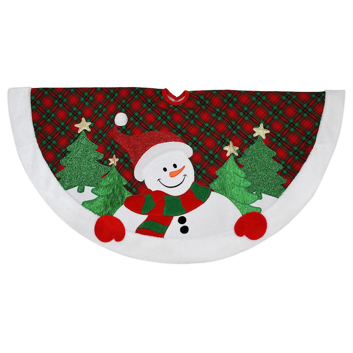Though the weather outside may be frightful, this tree skirt is “snow” delightful! Festive in red and green plaid, our 48″ tree skirt depicts a smiling snowman with Christmas trees all around. Encircled with white faux fur, tree skirt sports a variety of eye-catching fabrics and shimmering stitching and is lined with white sateen. Hidden Velcro strips will keep it neatly in place around your Christmas tree. Â