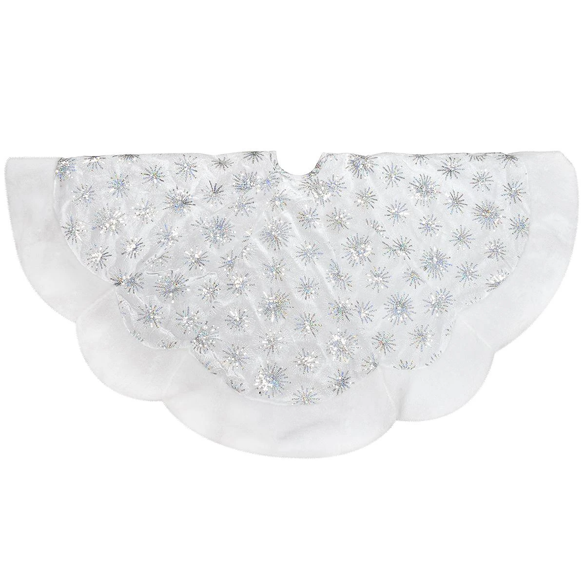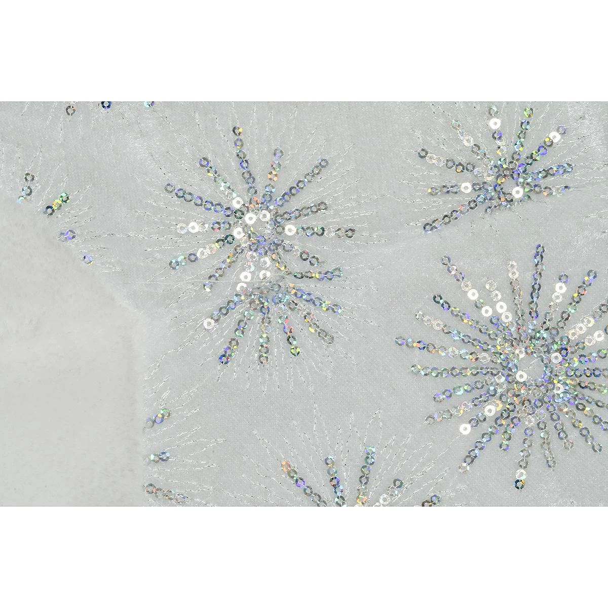 After you’ve hung the lights and special ornaments, why not skirt the issue with this beautiful 48″ white micro velvet tree skirt? Richly patterned with silver sequined snowflakes, tree skirt is trimmed with a plush white border and is fully lined in white sateen. Hidden Velcro strips hold it securely in place beneath the boughs of the tree.
