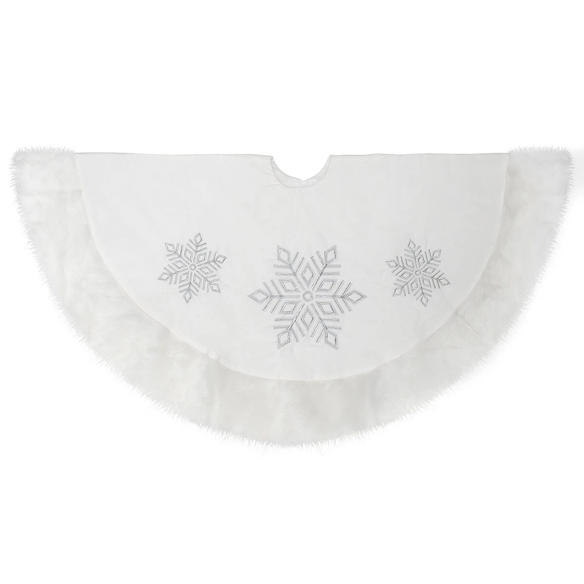 Wrap your tree with a winter wonderland theme! Patterned with snowflakes in shimmering silver stitching, our gorgeous 48″ white velveteen tree skirt is encircled with with a white faux fur border. Skirt is completely lined in white sateen and features hidden Velcro strips to hold it neatly in place around the base of your tree.