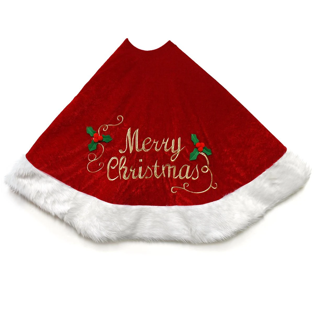 The sentiment “Merry Christmas” shimmers in gold stitching across this beautiful 56″ red velvet tree skirt. Adorned with holly accents crafted of green felt and red pom-poms, this enchanting tree skirt is edged in white faux fur. Completely lined in white satin, skirt features hidden Velcro strips to hold it securely in place.