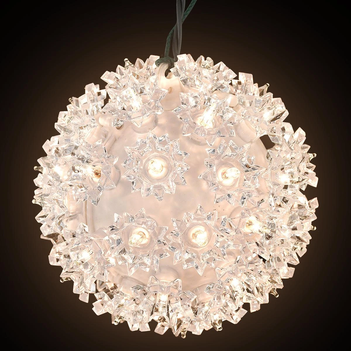 A brilliant choice for your holiday dΓ©cor, this 6″ CLEAR sphere with 50 white lights is as versatile as it is beautiful. Hang ball outdoors from tree branches, porches, gutters, and balconies or decorate indoors to brighten Christmas trees, mantels, centerpieces and more. Bright light sphere will stay lit even if one lamp goes out. Features include: