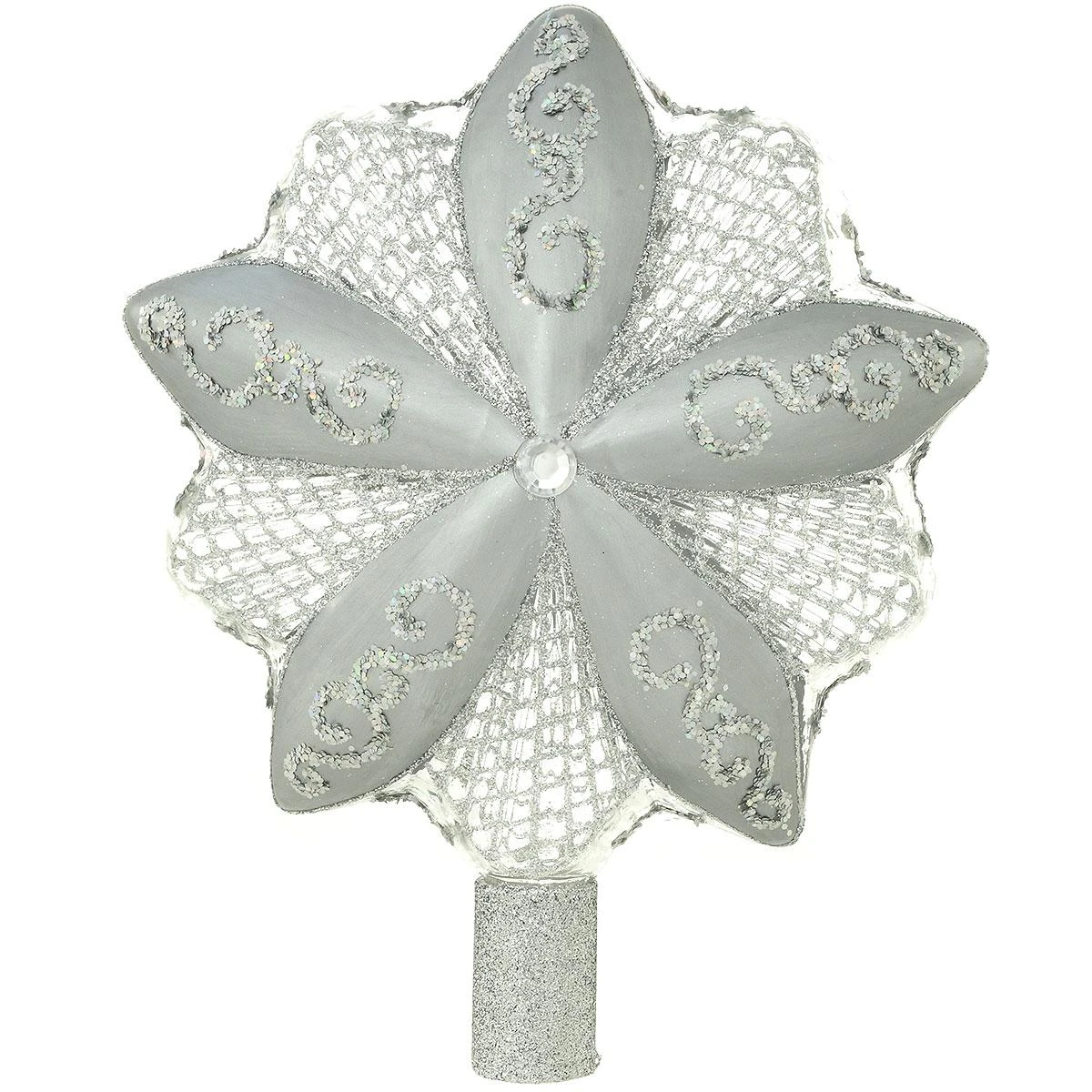Symbolizing that great light which led the wisemen to the Christ child, this beautiful star makes an excellent tree topper! Masterfully crafted of glass in Poland, this gorgeous double sided design features clear glass hand-painted with silver accents and mesmerizing patterns of sparkling, prismatic glitter. Sure to become a treasured favorite, this exquisite tree topper measures 7¼” tall.