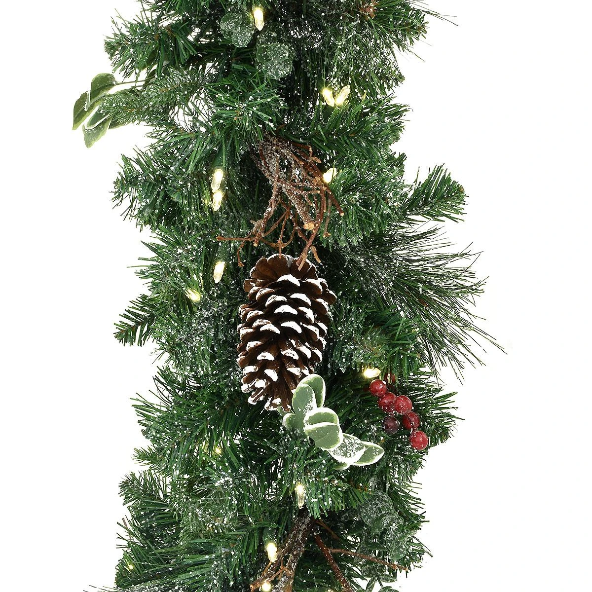 With its pleasing mix of life-like pine branches, red berries and natural pinecones all flocked with white “snow”, this festive 9′ long x 12″ wide Light Frost Garland is perfect for sprucing up a doorway, window, mantel or stairway. Illuminated with 100 warm white LED lights, this garland will light up your holidays! Features include: