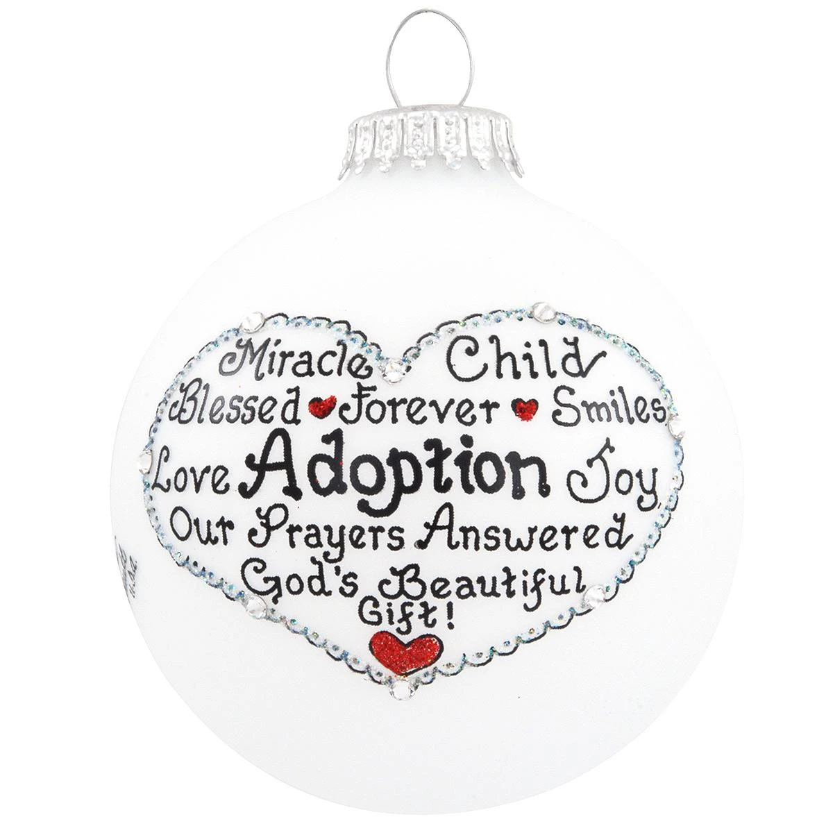Celebrating the growth of family, this stunning Heart Gifts design is uniquely crafted with inspired brush strokes, shimmering glitter accents, and dazzling Swarovski crystals. This beautiful Teresa Thibault design is hand-painted in the USA and comes attractively packaged for safe and easy gift giving. Measuring 3ΒΌ” tall, this glass ornament features a heart adorned with the word “Adoption” and the sentiment: Miracle Child, Blessed β₯ Forever β₯ Smiles, Love, Joy, Our Prayers Answered, God’s Beautiful Gift!