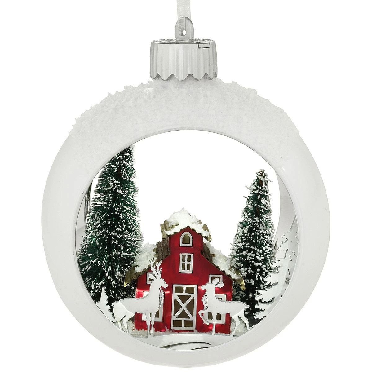 A pair of deer frolic amongst snowy pines in this enchanting barn scene. Dusted with sparkling “snow” our 4″ white glass ring ornament features a multi-media interior crafted of plastic, stiffened paper, wood and sisal. A glowing LED light softly illuminates barn scene with a twist of the ornament’s cap. Keepsake comes ready to hang on a white gossamer ribbon.