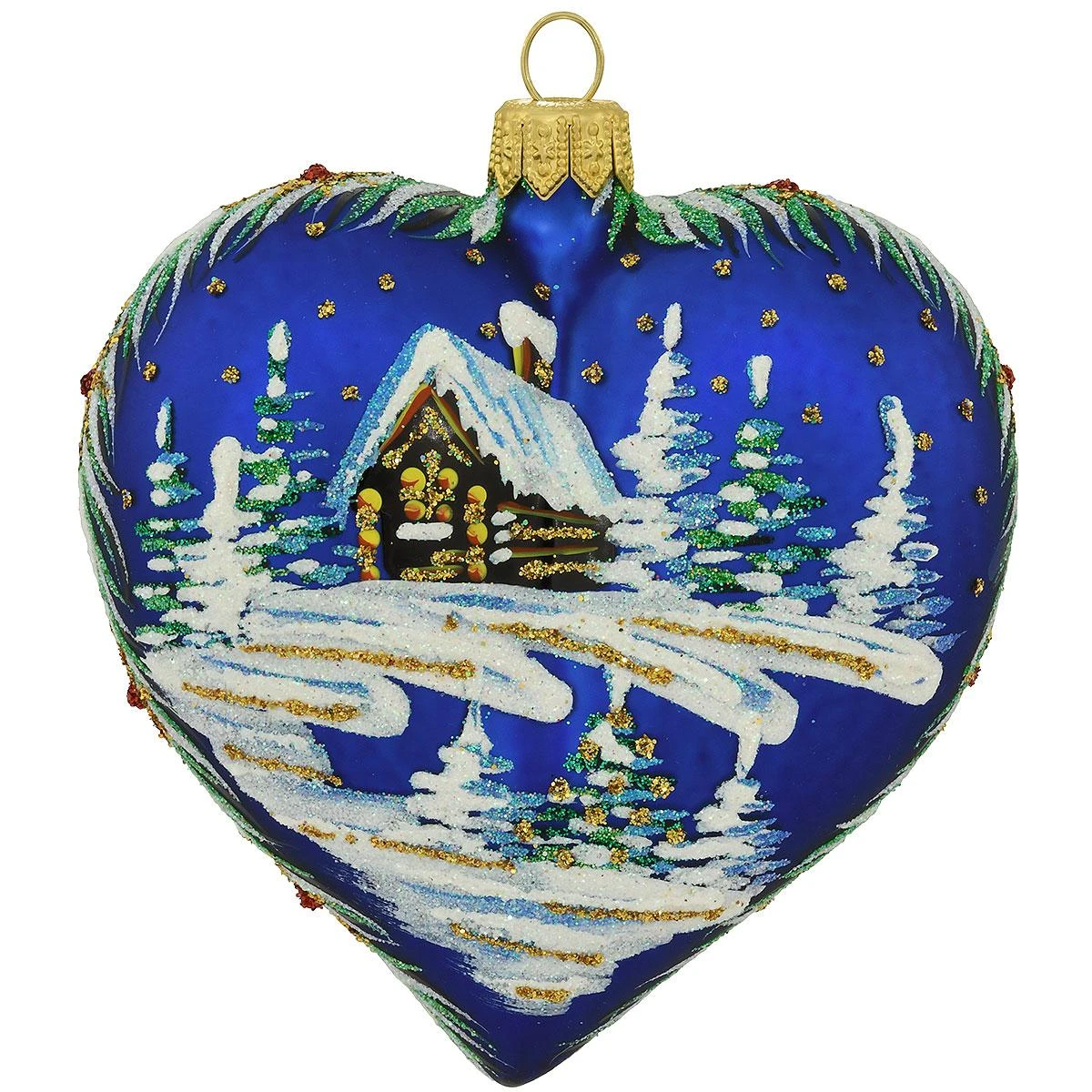 Home is where the heart is! Artfully hand-painted on both sides with an enchanting cabin and woodland scene, this charming ornament captures the magic of the season. Expertly crafted of glass in Poland, this beautiful heart shaped ornament measures 3½” tall and shimmers with a myriad of vibrant glazes and dazzling glitter accents.