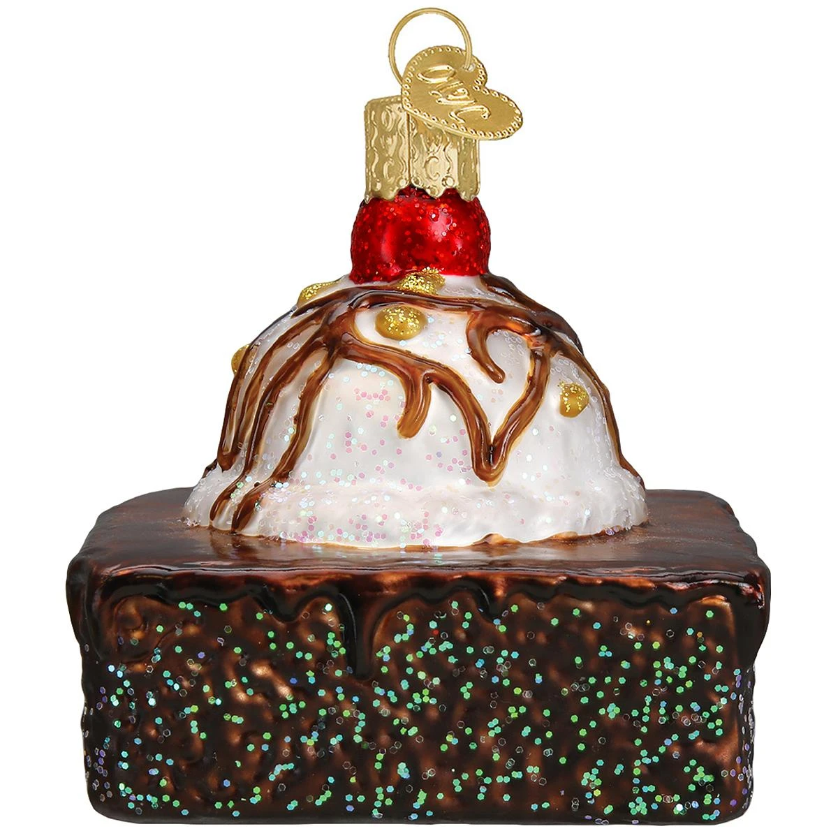 Are you saving some room for dessert? Topped with vanilla ice cream, chocolate syrup, nuts, and a cherry, our brownie is too tempting to resist. With sparkling glitter accents and crafted of glass from Old World Christmas®, this 2½” tall brownie a la mode ornament will make a sweet choice for dessert lovers and food-themed trees!