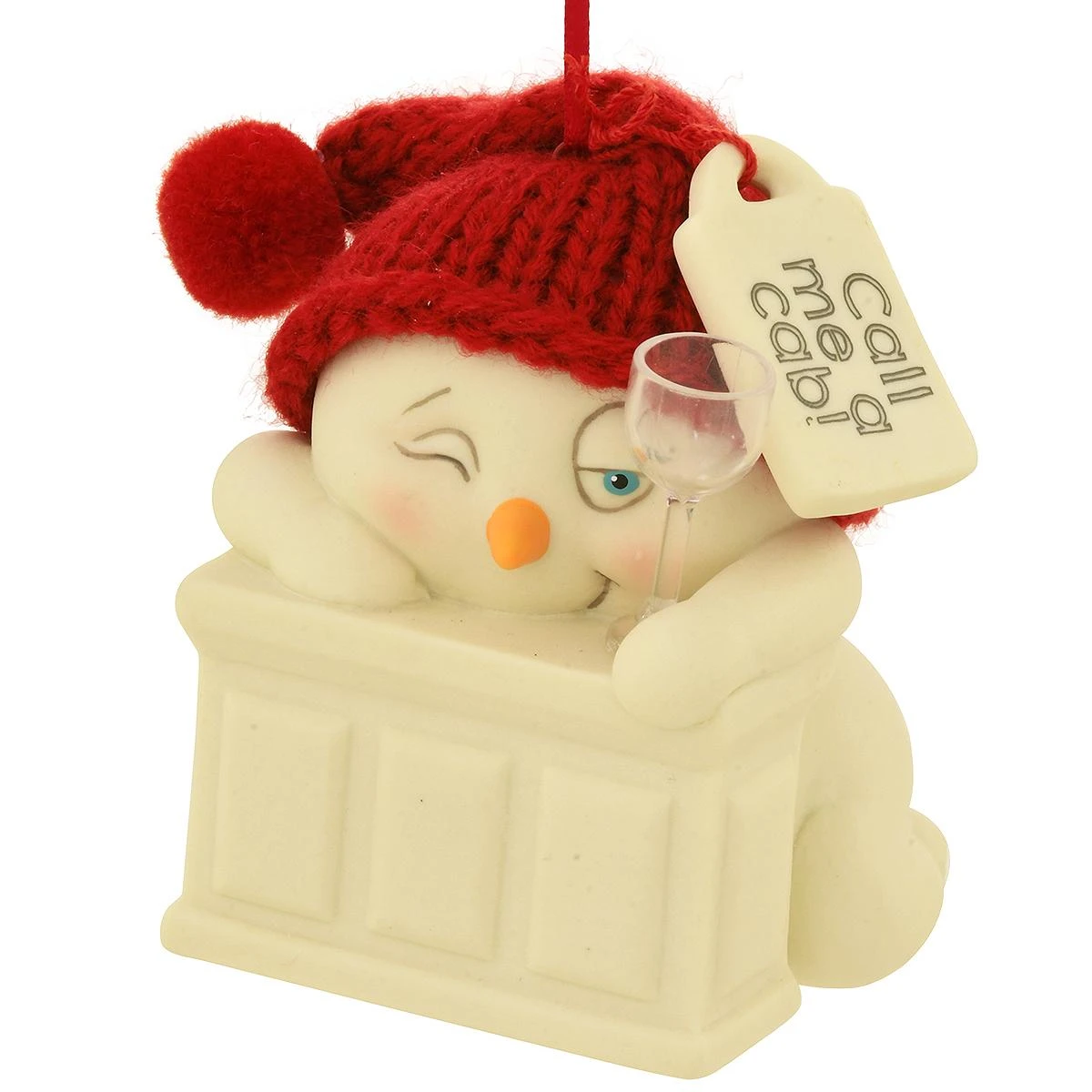 It’s a “Last Call” for this fun Snowpinion who’s having a fine time with wine! Crafted of porcelain bisque with red knit accents, this adorable Snowpinions® ornament comes ready to hang with a red ribbon and measures 2¾”. Sentiment tag reads: “Call me a cab!”