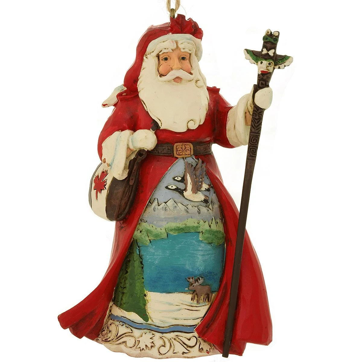 This handsome 4½” Canadian Santa ornament by Jim Shore honors the unique culture and traditions of our neighbors to the North. St. Nick holds a staff topped with a bird totem referencing Canada’s indigenous people while a brilliant red maple leaf adorns his shoulder satchel. Santa’s quilt-inspired gown depicts picturesque images of wildlife, mountains, pine trees, and crystal clear lakes. Coming ready to hang with a twine cord, this beautiful stone resin ornament is sure to become a treasured keepsake!Â