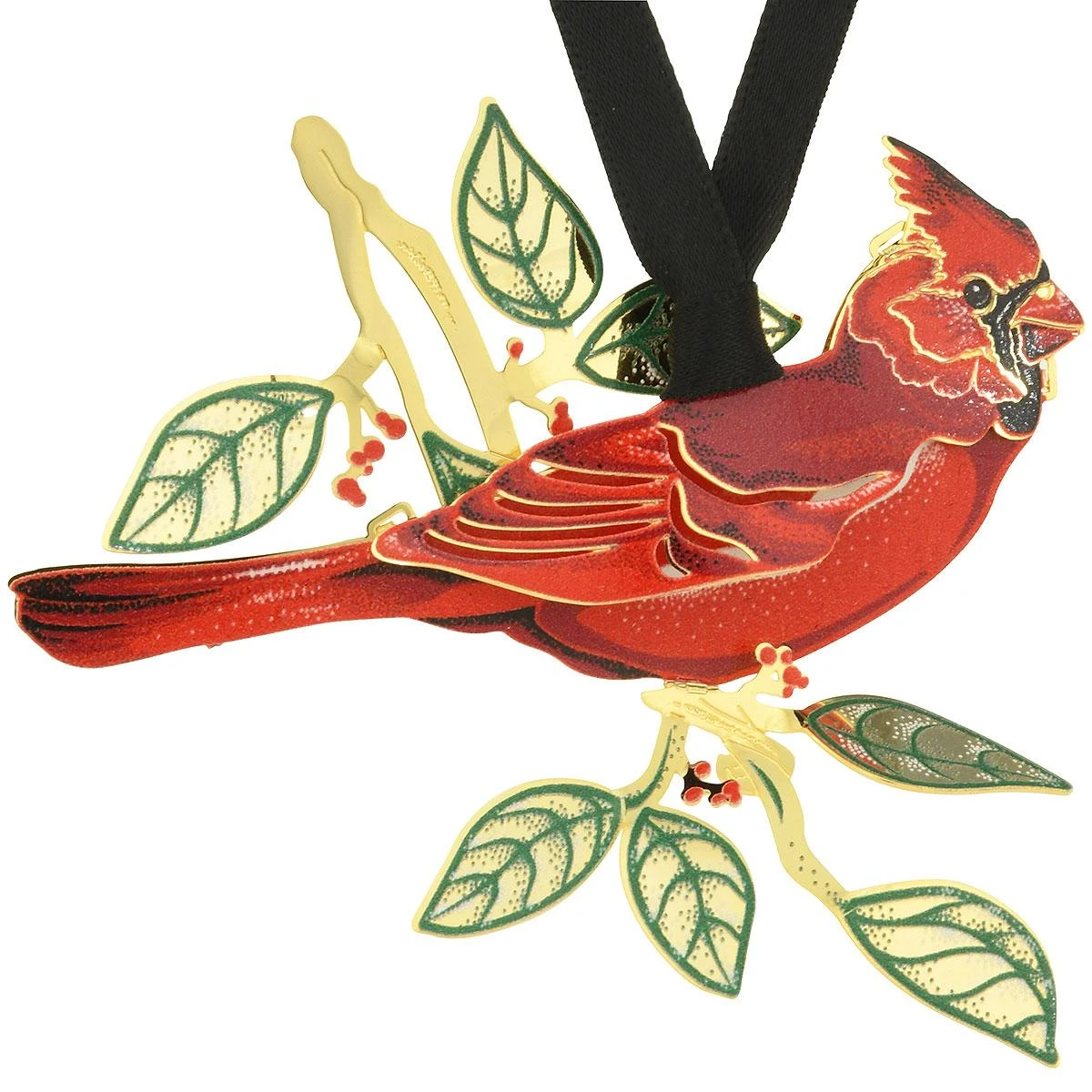 A brilliant cardinal finds a lofty perch on a tree branch loaded with green leaves and red berries in this delightful 3-D design. Etched from solid brass and finished in 24 karat gold, our beautiful metal cardinal in nature ornament is hand lacquered with colorful accents and is sure to lift your spirits for many joyous holidays to come! 2¾” tall ornament comes ready to hang on a black ribbon and is attractively boxed for easy gift giving. Made in the USA.