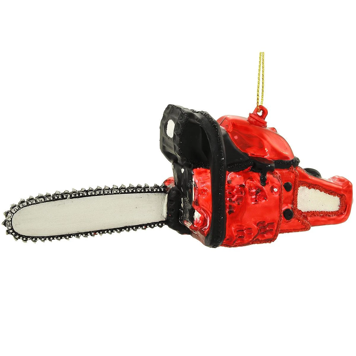 Looking for a cutting edge gift for your favorite lumberjack, arborist or ice carver? You couldn’t “axe” for anything better than this handsome chainsaw ornament skillfully crafted of glass and resin. Coming ready to hang with a gold cord, our red, silver, and black chainsaw ornament shimmers with bright glazes and sparkling glitter accents and measures approximately 2″ tall x 5ΒΌ” wide. It just may be the “sharpest” gift your loved one has ever “saw”.
