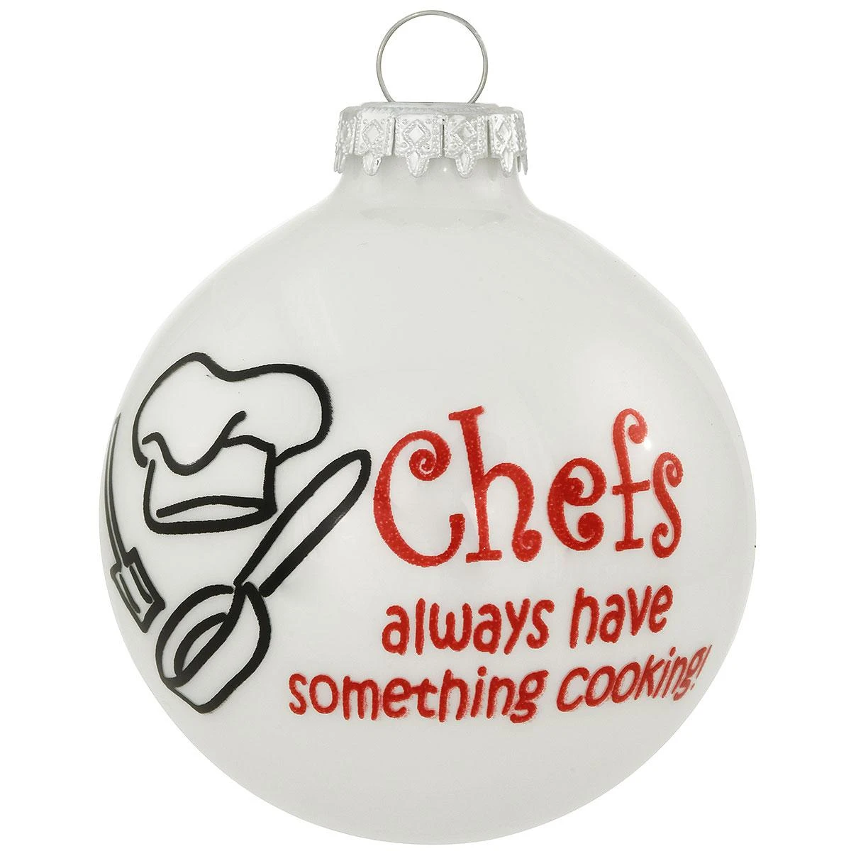 Your special chef is sure to love this taste-ful design! A shimmering red “chefs” sentiment adorns this shimmering opal ornament along with vivid black outlines of a spatula, skillet and chef’s hat. Crafted exclusively for Bronner’s from glass in Hungary, this vibrant 3″ ornament features the sentiment: Chef’s always have something cooking!