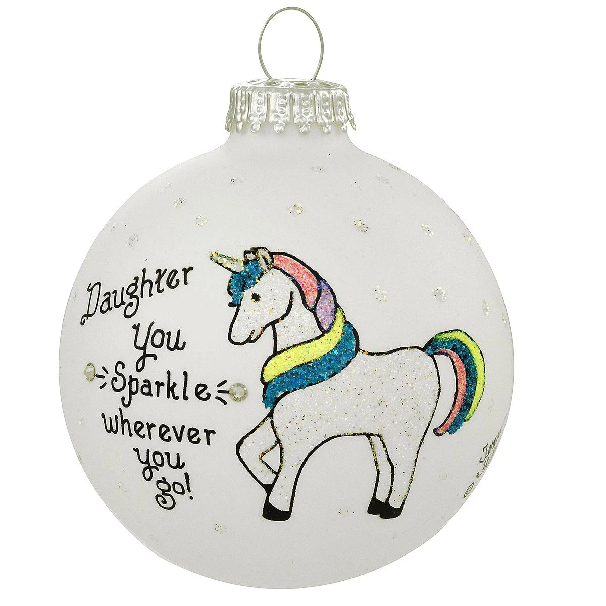 Daughter you Sparkle wherever you go is the sentiment expressed on this charming Teresa Thibault design. Depicting a sparkling white unicorn with rainbow glitter stripes, this beautiful 3ΒΌ” glass ornament is uniquely crafted of glass in the USA and features a sprinkling of dazzling Swarovski crystals. Keepsake comes attractively packaged for safe storage and easy gift giving. A great gift for the daughter who adds sparkle and shine to your life!