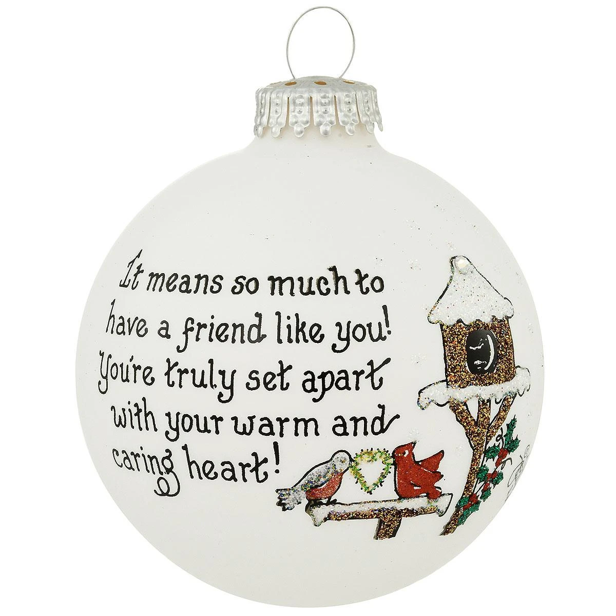 Uniquely crafted with inspired brush strokes and colorful glitter accents, this charming 3ΒΌ” glass ornament is perfect for a friend with a caring heart! Depicting a birdhouse with two birds perched happily nearby, this beautiful hand-painted design by Teresa Thibault is embellished with a dazzling Swarovski crystal. Crafted in the USA, this stunning Heart Gifts keepsake comes attractively packaged for safe storage and easy gift giving. Sentiment reads: It means so much to have a friend like you! You’re truly set apart with your warm and caring heart!