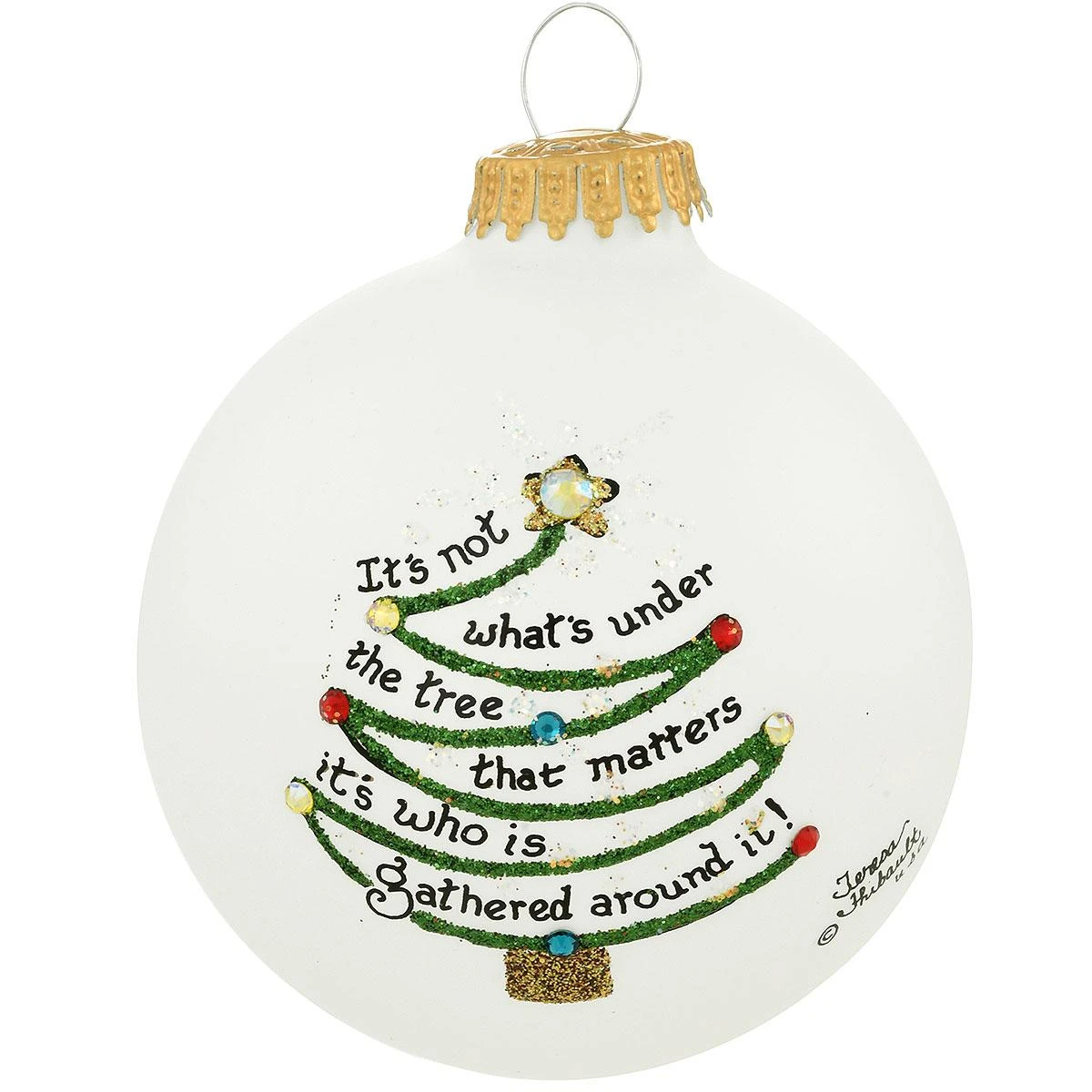 Uniquely crafted with inspired brush strokes and colorful glitter accents, this charming 3¼” glass ornament makes a wonderful gift for family and friends! Hand-painted from a design inspired by Teresa Thibault, this charming Heart Gifts ornament is proudly crafted in the USA and is adorned with a sprinkling of dazzling Swarovski crystals. Design features a Christmas tree along with the sentiment: It’s not what’s under the tree that matters—it’s who’s around it!