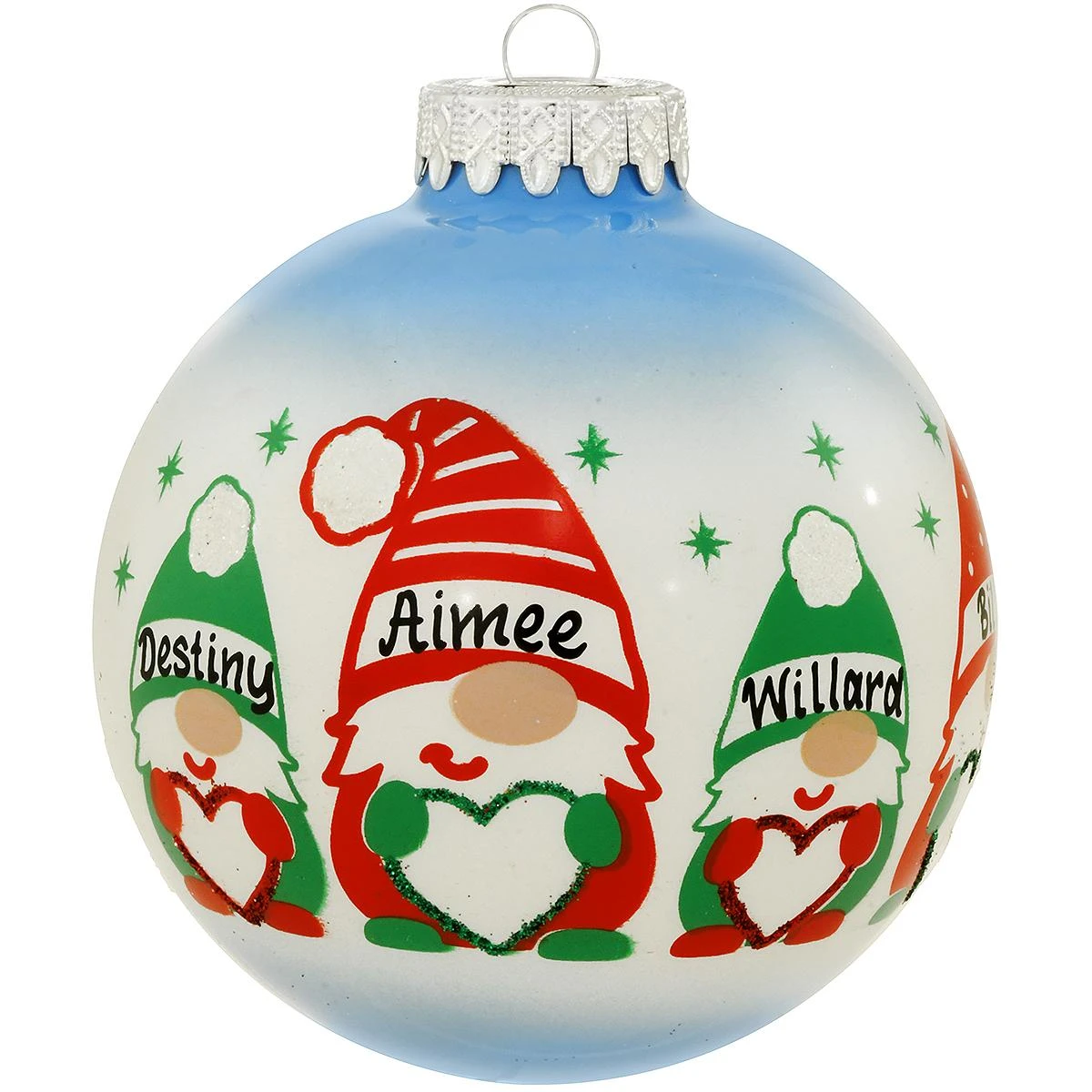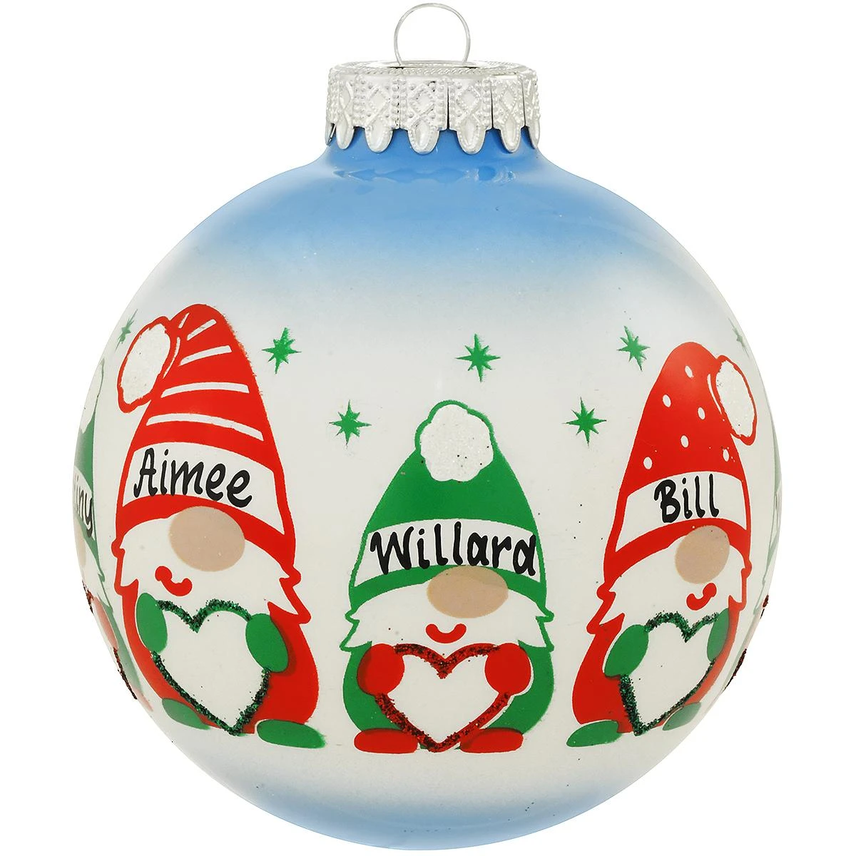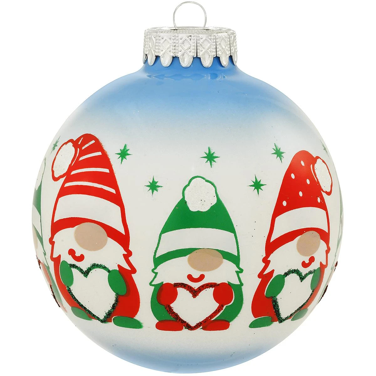 For this happy family…GNOME is where the heart is! Our shimmering 2 tone blue and white ornament is artfully crafted in glass and features 5 gnomes (2 parents and 3 kids) holding hearts as stars twinkle all around. Adorned with vivid red and green glazes and iridescent hand-glittered accents, this 4″ round keepsake makes an enchanting gift for the special family on your list! Crafted in Hungary exclusively for Bronner’s.Â