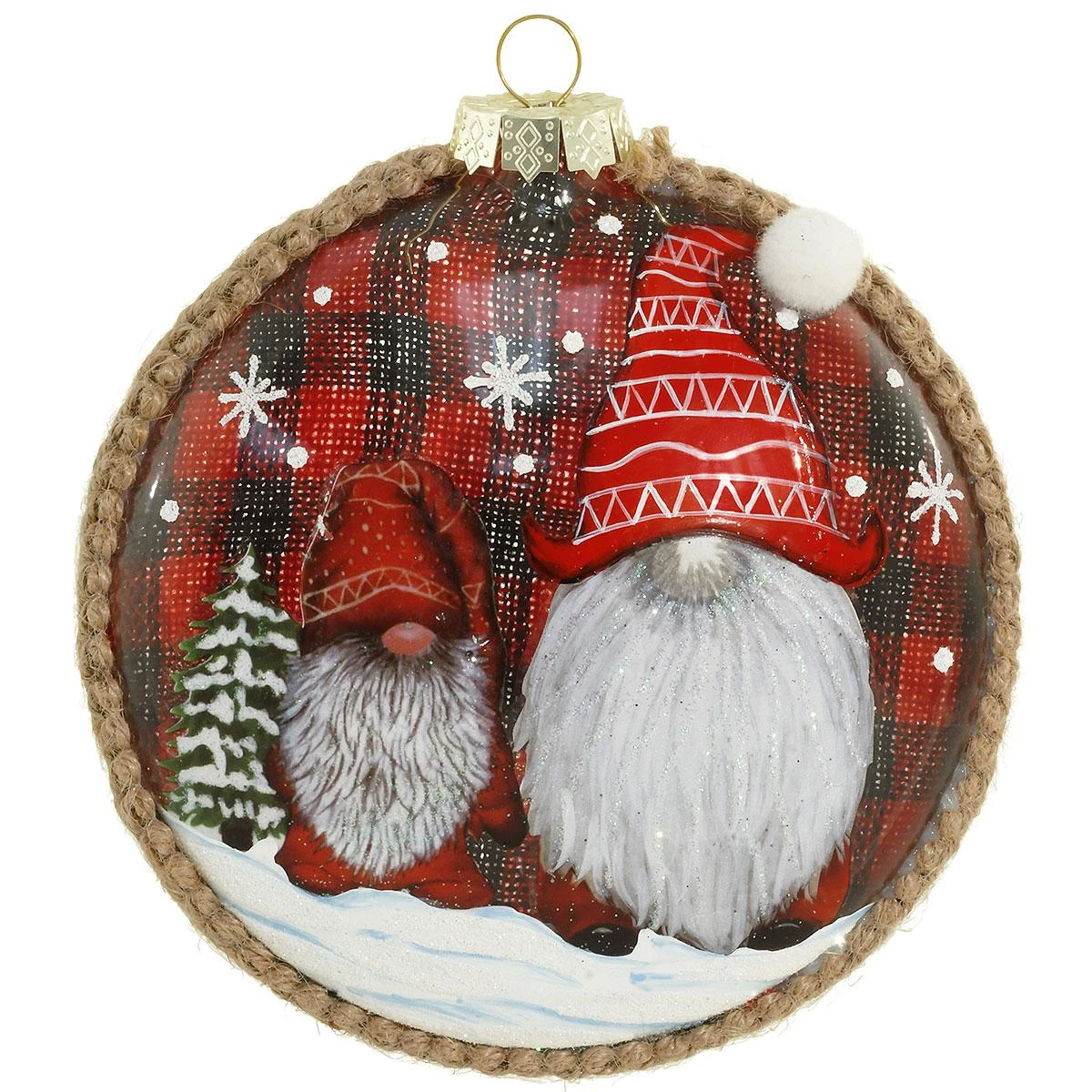 Two gnomes stand beard-to-beard in the snow dressed in warm red thermal stocking caps. Adorned with plaid fabric accents and charming jute trim, our gnomes disc glass ornament shimmers with sparkling glitter accents and measures 5ΒΌ”.Β