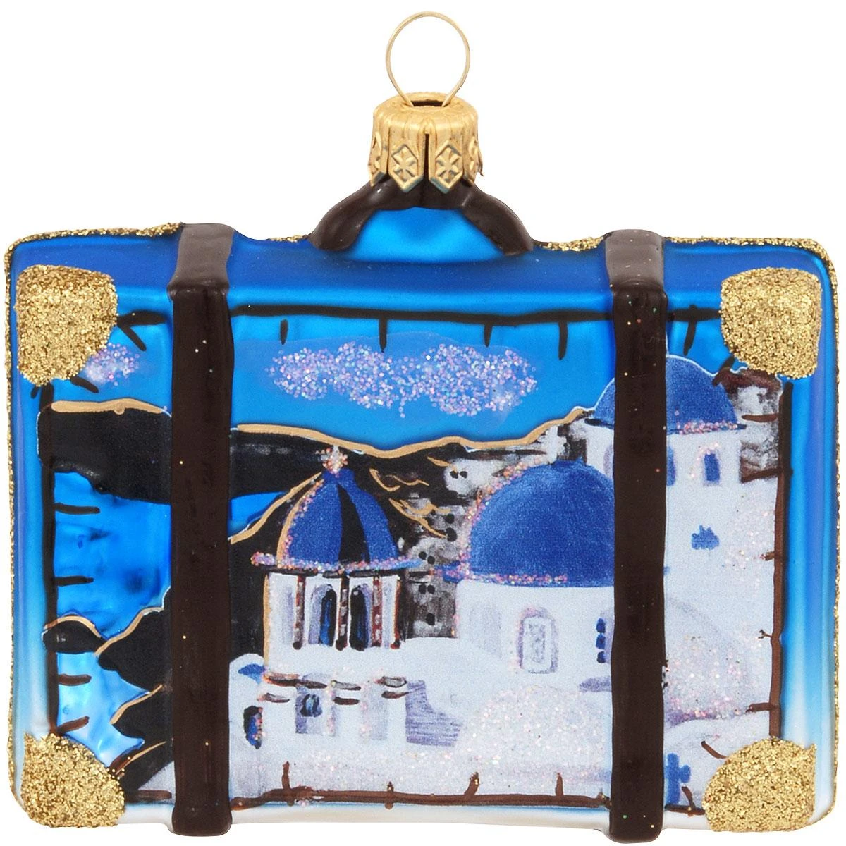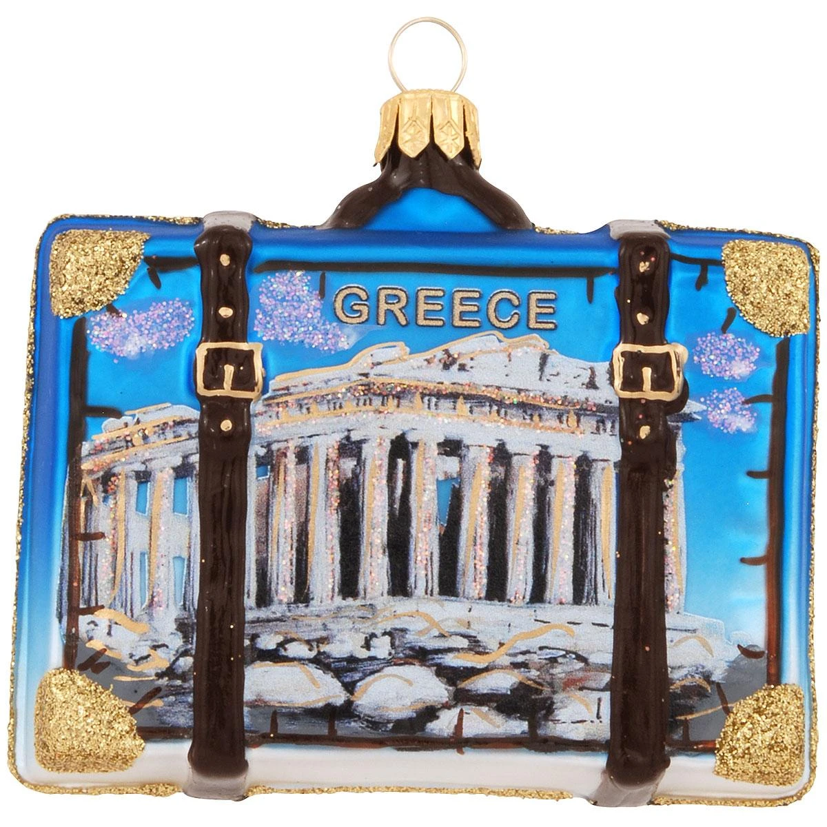 Unpack special memories of your Greek vacation with this exquisite ornament! Masterfully crafted of glass in Poland, our “leather-strapped” satchel features the destination GREECE with a spectacular view of the ancient Parthenon on the front and picturesque Santorini Island on the reverse side. Filled with old-world charm, this scenic 2½” tall by 3″ wide Greece travel suitcase ornament shimmers with a myriad of vibrant glazes and sparkling glitter accents and will make a great gift for the globetrotter on your Christmas list!