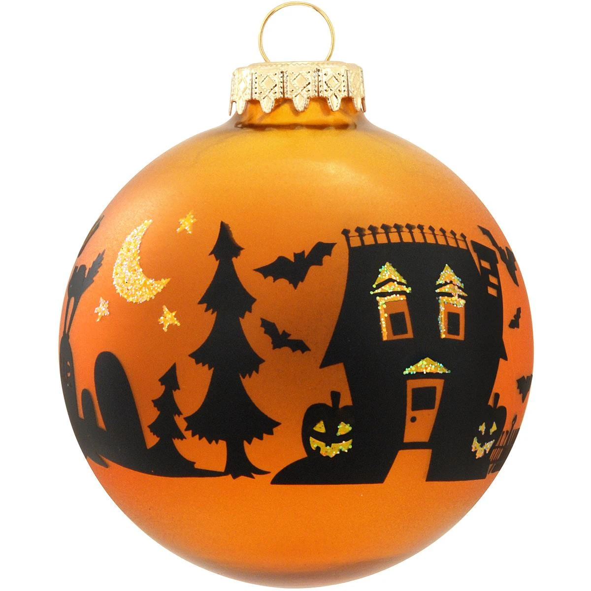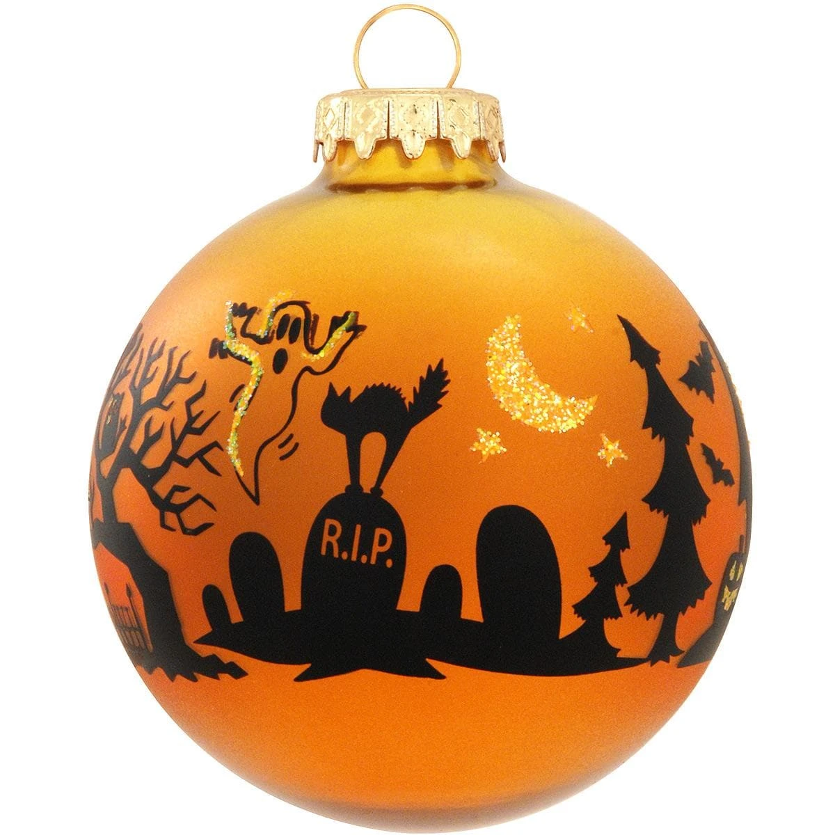 A SPOOK-tacular scene for all to BOO-hold! Exquisitely crafted of glass from Hungary, our 3″ tall Halloween nightscape ornament features an orange and marigold translucent finish with a frosted band of “fog” to set a vibrant backdrop for shadowy silhouettes of eerie homes, bats, trees, and a cemetery. Enthusiasts of the autumn holiday are sure to delight at the opportunity to let this ornament Rest In their Presence!