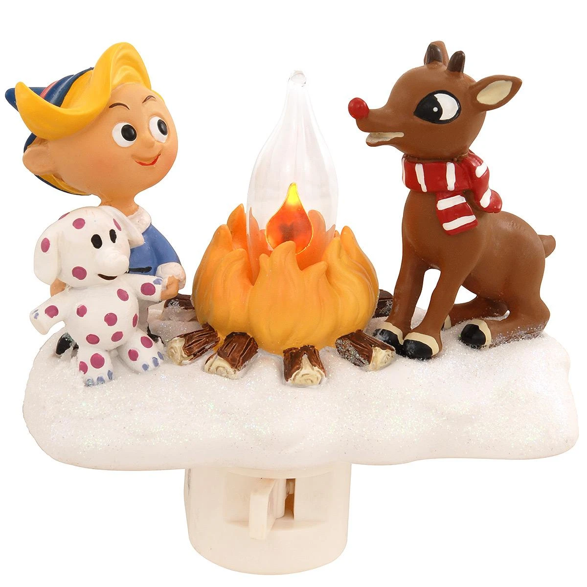 Brighten your holidays with this adorable Hermie and Rudolph® campfire night light! With an overall height of 4¼” and crafted of resin, this 3″ tall x 4½” wide nightlight is casting classic Rudolph the Red Nosed Reindeer® characters in the glow of a roaring campfire. Includes swivel plug that conveniently plugs into any standard 120 v outlet and an on/off switch to maximize bulb life.