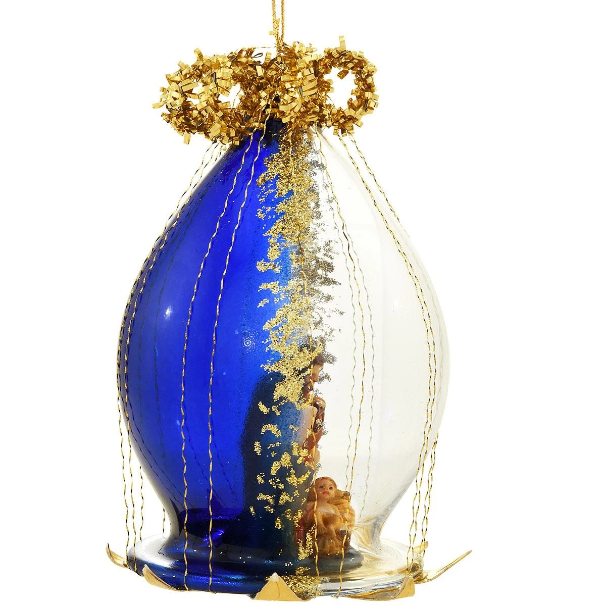 Silent night, holy night, all is calm, all is bright! Within this exquisite glass dome are finely detailed figures of the holy family before a royal blue background like a sapphire night sky. This vintage style Christmas keepsake is adorned with dazzling gold embellishments (angel hair and metallic chenille stems) and rests on a star-shaped paper base of shimmering gold. Hand-crafted in Germany, ornament comes ready to hang on a gold cord and measures approximately 3½” tall.