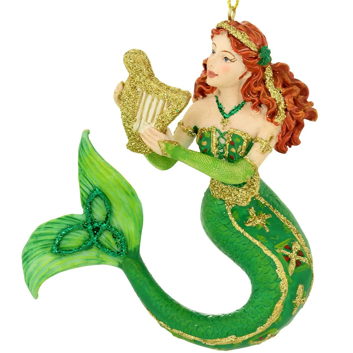 Ancient folklore states that Merrows (Irish sea maiden) were said to be beautiful, modest, gentle, and affectionate with a propensity to seek mates on land. Artfully crafted of resin, our charming Irish mermaid ornament depicts the mythical creature playing a golden harp with a Celtic trefoil design on her fin. Resplendent in hues of green with sparkling gold glitter accents, this whimsical 3¾” tall ornament comes ready to hang with a gold cord.