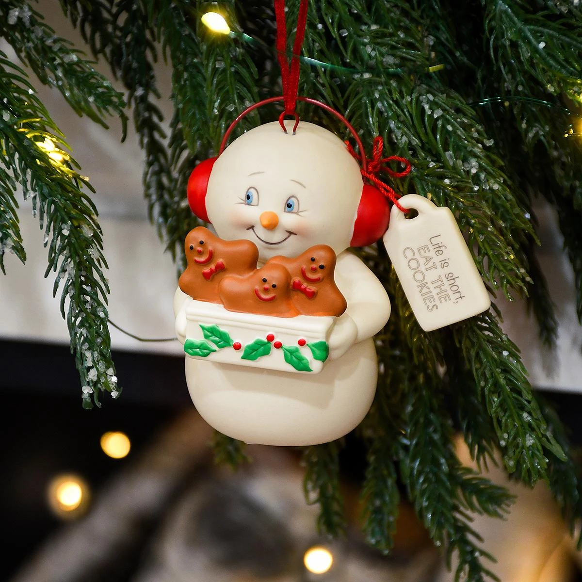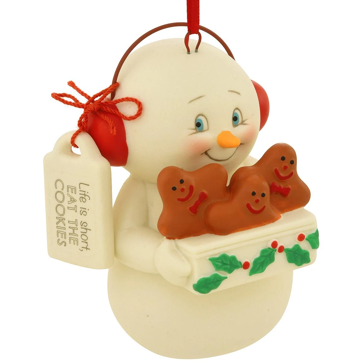 Is it OK to eat more cookies than you bring to a cookie exchange? Oh yes, indeed! Crafted of porcelain bisque, this adorable Snowpinions® ornament features a snowman in red earmuffs holding a festive tray of gingerbread men. 3″ collectible comes ready to hang with a red cord. Sentiment tag reads: “Life is short, eat the cookies”.