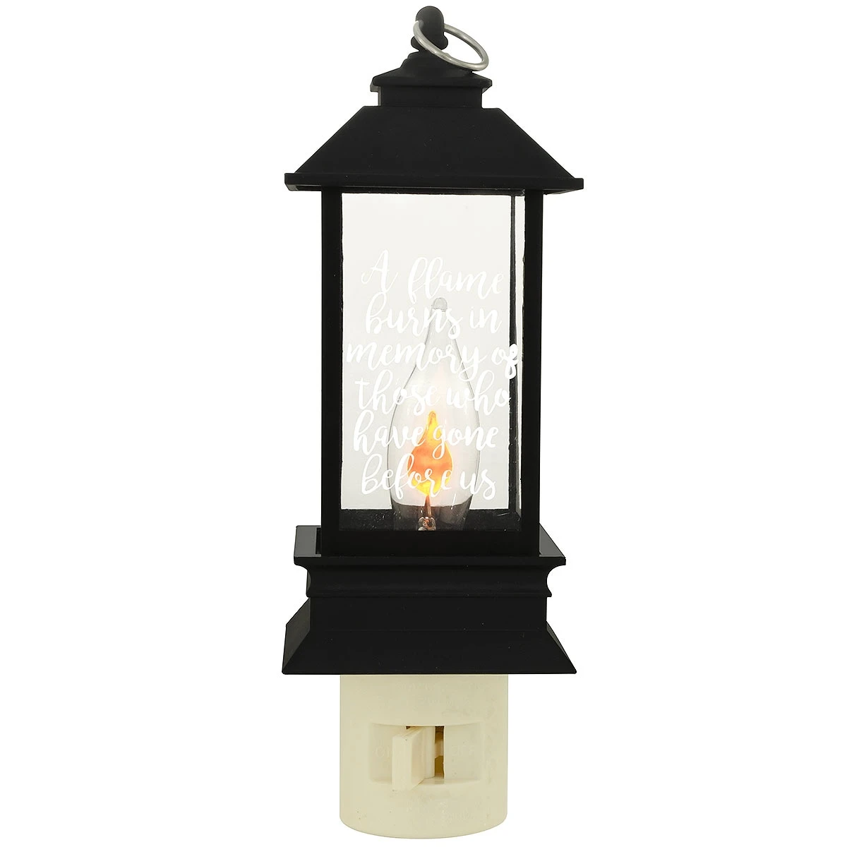 The sentiment scripted in white on this beautiful memorial lantern night light reads: “A flame burns in memory of those who have gone before us.” Flickering with an orange flame, 6″ black lantern nightlight is crafted of plastic and includes bulb and 360 degree swivel plug-in base with on/off switch. UL listed.