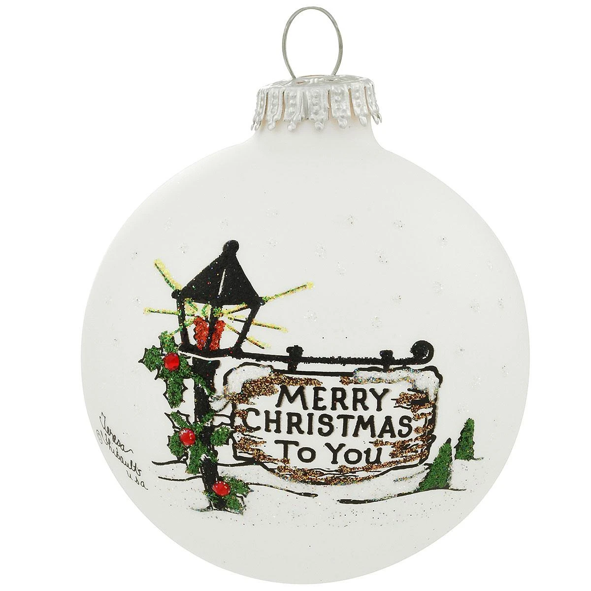 Uniquely crafted with inspired brush strokes and colorful glitter accents, this charming 3ΒΌ” glass ornament makes a wonderful gift for friends, neighbors, and family! Hand-painted from a design inspired by Teresa Thibault, this charming Heart Gifts ornament is proudly crafted in the USA and is accented with a sprinkling of dazzling Swarovski crystals. Design features a glowing lamppost festively decorated with holly. Sentiment reads: MERRY CHRISTMAS to you